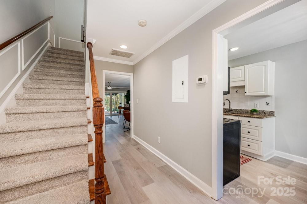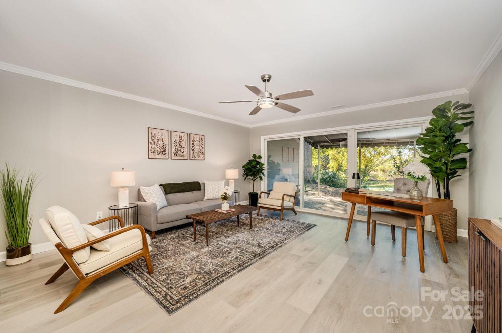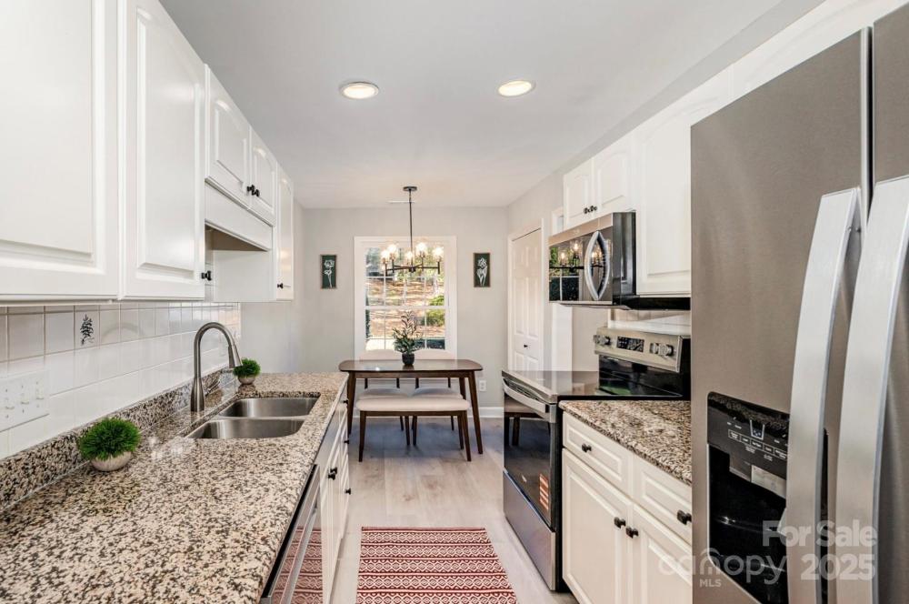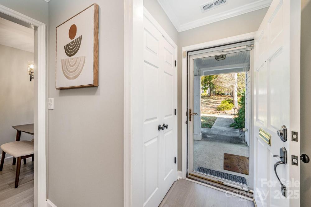 Welcome home to your beautifully updated condo with a townhome-like layout in highly sought-after Quail Hollow East at Quail Hollow Estates—known for its prime location, scenic landscapes, mature trees, and well-spaced buildings. This move-in ready home shines with fresh paint and new hardware, lighting and plumbing fixtures, LVP flooring, carpet, and stainless steel kitchen appliances. The spacious living and dining area opens to a private brick patio with a new awning and serene pond views and access—perfect for relaxing or entertaining. The kitchen offers granite countertops, a cozy breakfast nook, and pantry. There is ample storage throughout and the flexible two-bedroom layout allows for a home office or guest room. Both bedrooms include generous closet space, including a walk-in closet in the primary suite. Enjoy premium amenities including two pools, clubhouse, tennis and pickleball courts, and scenic ponds. Exceptional location near Sharon Rd. and Park Rd.—minutes to Quail Corners, SouthPark, Park Road Shopping Center, Carolina Place, Quail Hollow Club (home to prestigious golf tournaments!), Little Sugar Creek Greenway, parks, schools, and interstates. Includes two assigned spaces, one covered, plus guest parking.