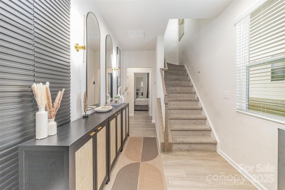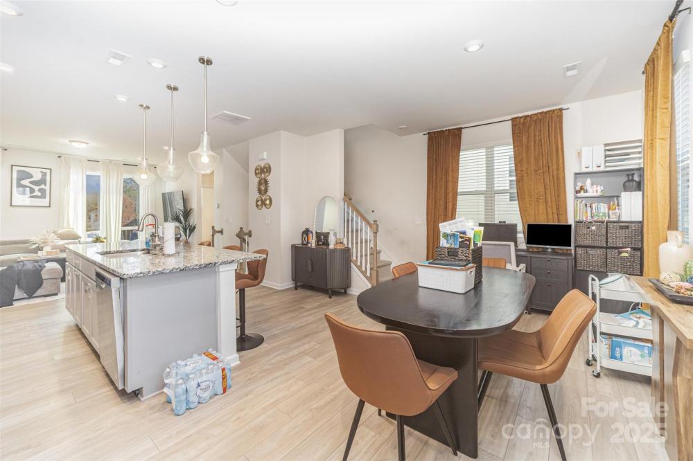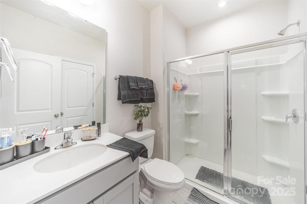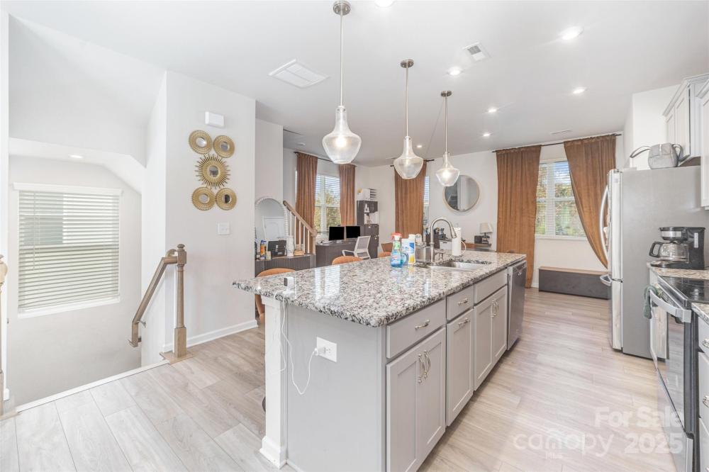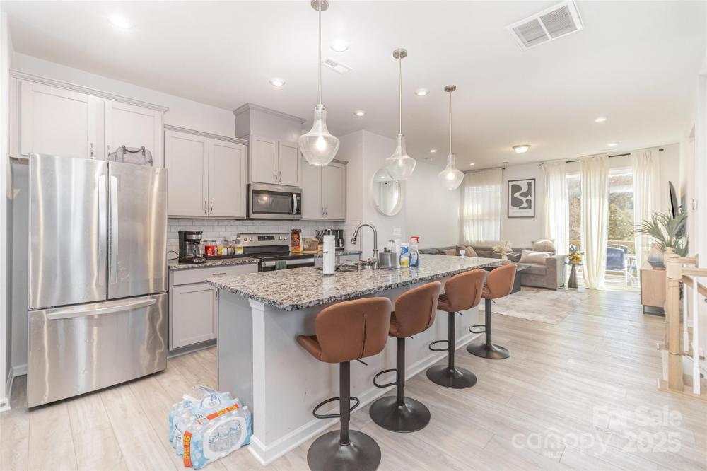 End unit three story townhome with balcony and back patio area. Home is located inside I-485 and is less than 10 miles from Uptown Charlotte. Inside main entrance level is a second primary option with attached full bath and spacious entrance foyer plus back door leading to covered patio area perfect for summer grilling! Upstairs is the spacious open living area that is flooded with natural light. Living room has sliding glass door that leads to your private balcony. Stunning kitchen has pendant lighting over the spacious island w/ breakfast bar seating + matching S.S appliances and neutral gray cabinets & pantry for plenty of storage. Upper level boasts 2 guest beds allowing for a potential office area and full hall bath plus primary bedroom suite. Primary has large walk-in closet and attached full bath w/ dual sinks & walk-in glass shower. All located in a small quiet community with restaurants, shopping & grocery options nearby.