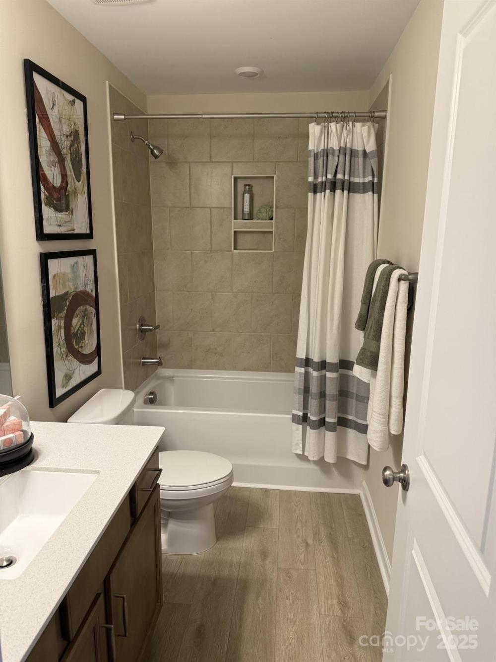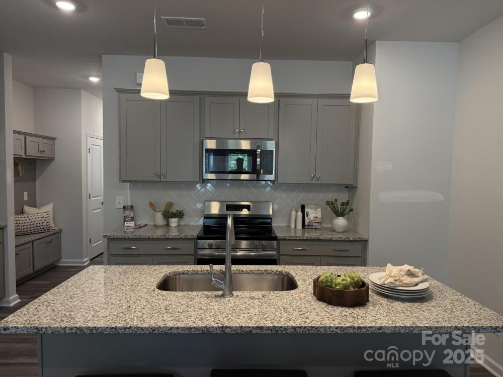 This thoughtfully designed two-story townhome offers three bedrooms and two-and-a-half bathrooms. Just inside the entrance, you'll find an open-concept great room that flows seamlessly into the kitchen and eat-in dining area. Upstairs, the primary suite includes a spacious walk-in closet, with a boxed ceiling and dual vanities for added luxury. Two additional bedrooms and a full bathroom are also located on the second floor, along with a conveniently placed laundry closet just outside the secondary bedrooms. A powder room is located just inside the entry from the attached one-car garage, with a built-in bench and cubby to keep essentials in check.