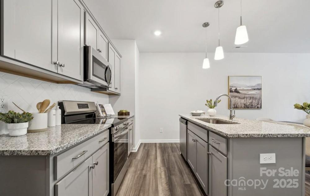 This well-designed two-story townhome features three bedrooms and two-and-a-half bathrooms. Upon entry, you’re welcomed by an open-concept great room that effortlessly connects to the kitchen and casual dining area, creating a spacious and inviting main level. Upstairs, the primary suite boasts a large walk-in closet, a boxed ceiling for added elegance, and dual vanities in the en-suite bath. Two additional bedrooms share a full bathroom, and a conveniently located laundry closet sits just outside the secondary bedrooms. A powder room is positioned near the entry from the attached one-car garage, along with a built-in bench and cubby—perfect for keeping everyday items organized.