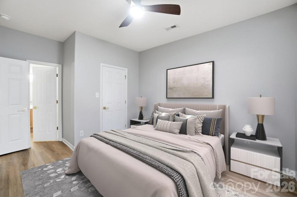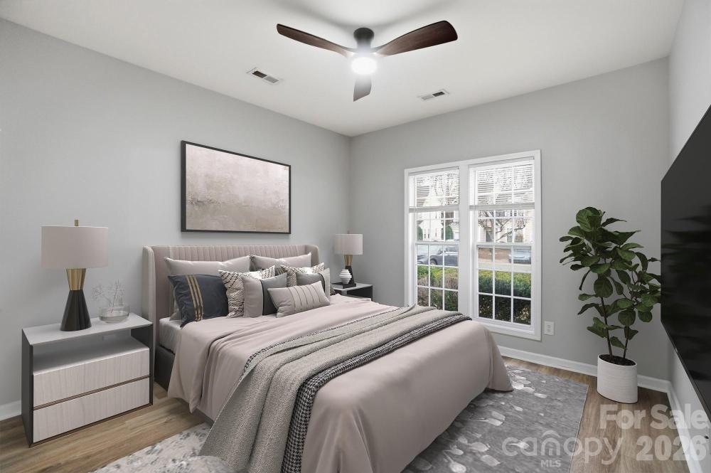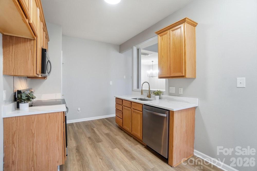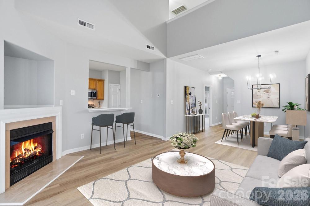 Beautifully updated 3 Bed, 2 FULL Bath END UNIT! 20ft vaulted ceiling in the living room with fireplace, primary bedroom on the main level w/ ensuite bathroom. Long list of updates include new flooring throughout, new quartz countertops, new Samsung stainless steel stove/range, dishwasher & microwave, new light fixtures, door hardware, faucets, and other cosmetics. This is a TURNKEY property, located 3 min. from Rivergate shopping center, 10 min. to Lake Wylie and just ~25 min. from CLT Int'l airport & Uptown. Hot water heater ('23), HVAC (Nov '24). Low HOA of $192 per month covers exterior maintenance, lawn care, Clubhouse & Pool! 2 assigned parking spaces in driveway. Property is eligible for a 0% down mortgage PLUS up to 20K in lender credits to cover closing costs. Great opportunity for anyone looking for a low maintenance property close to everything in the Southwest Charlotte!