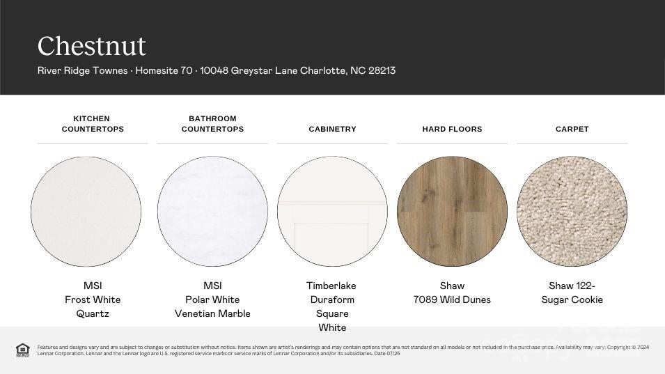 The first level of this two-story townhome is host to a spacious open floorplan shared between the kitchen, Great Room and breakfast nook. Access to a patio makes indoor-outdoor living and entertaining simple. All three bedrooms are found upstairs, including the luxe owner’s suite which features an en-suite bathroom and walk-in closet. Plus, our signature Everything's Included program means you will get quartz or granite kitchen countertops, subway tile backsplash, ceramic tile, and luxury vinyl plank flooring at no extra cost! River Ridge Townes is a community that offers a serene lifestyle just 20 minutes away from Uptown Charlotte, making it easy to enjoy the best the city has to offer. Walkable retail experiences are just four minutes away at Farmington Village. Nearby Harrisburg Park and PNC Music Pavilion offer tons of outdoor recreation and activities.