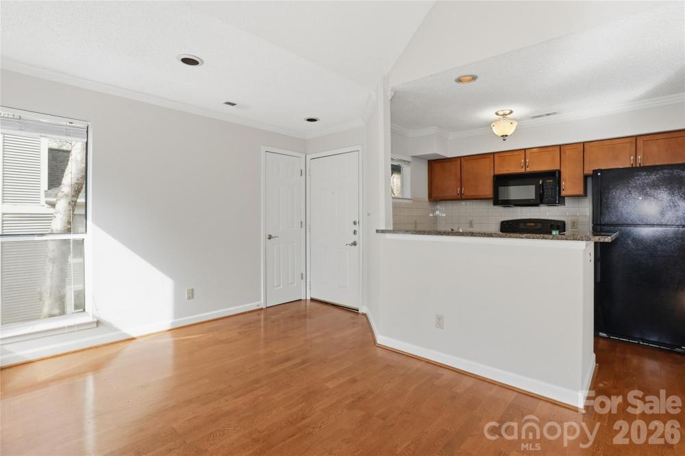 This isn't just another condo. It's on a corner on the third floor, with its own entrance. So, it has the kind of privacy at the entrance that's nearly impossible to find in this price range. Step inside and look up. Vaulted ceilings in the living room create a sense of space that units on lower floors don’t have. The open flow from kitchen to living area means you can actually cook and hang out at the same time. Granite counters, tile backsplash, and a breakfast bar that doubles as your WFH lunch spot or weekend coffee bar. Hardwood floors, crown molding, and a fireplace give it that polished, inviting feel without trying too hard. The bedroom has a walk-in closet (yes, an actual walk-in) and your own private covered balcony. Perfect for morning coffee or decompressing after a long day. Fresh paint throughout means you're moving into a clean slate that's move-in ready, not a project. Location-wise, you're minutes from Uptown, Charlotte's hospital corridor, and centrally positioned between Eastover and Elizabeth. Meaning the best restaurants and coffee shops in those neighborhoods are right at your doorstep.
