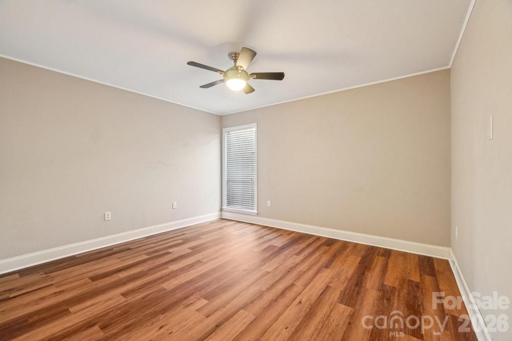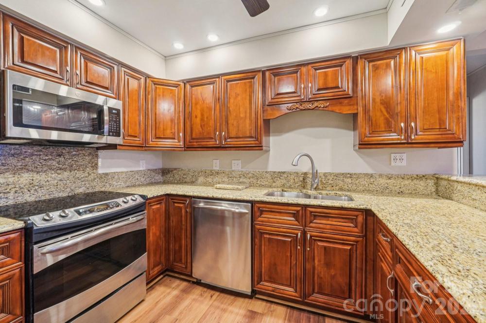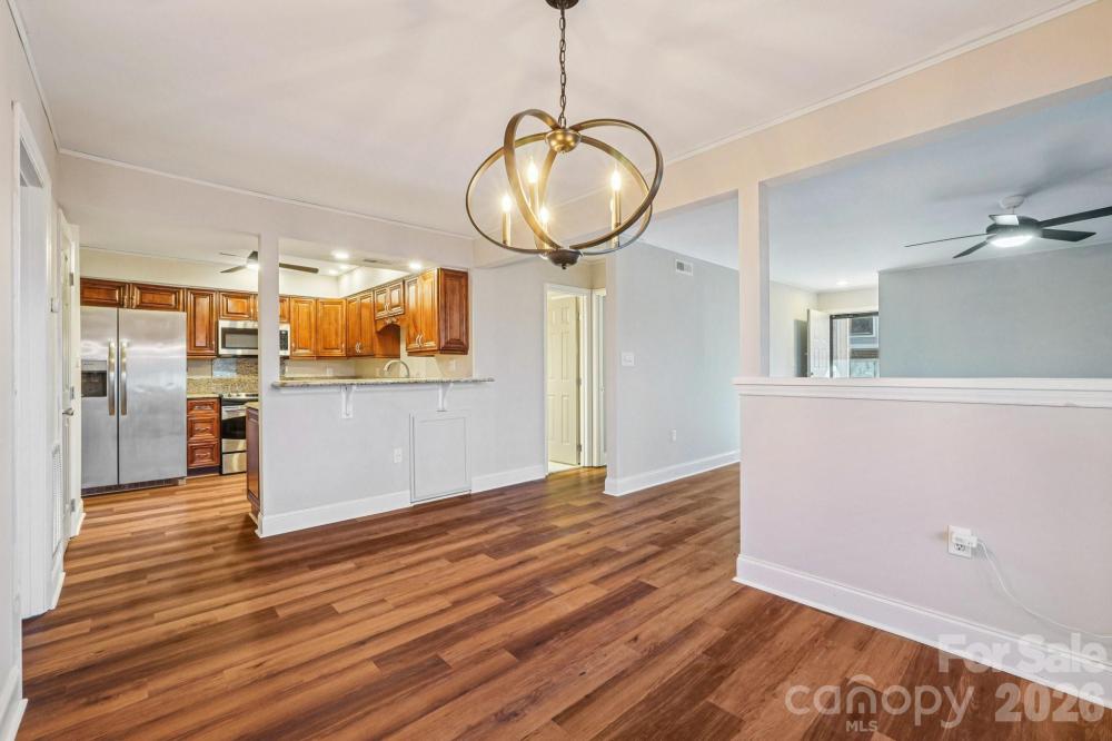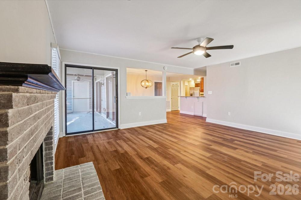 This charming ground-level updated 2-bedroom home in the heart of Raintree’s Muirfield offers a prime South Charlotte location close to shopping, dining, and daily conveniences. Move-in ready, it features fresh interior paint and new flooring throughout most of the home with tile in the bathrooms for a clean, bright, and neutral feel. The open layout flows from the spacious living room, centered around a cozy fireplace, to two generous bedrooms and two full baths — the primary with a walk-in shower and the secondary with a tub/shower combo. A contemporary chandelier anchors the dining area just off the kitchen boasting stainless steel appliances, ample cabinetry, granite countertops, a pantry. The laundry room conveniently sits just off the kitchen with space for overhead storage. A large, covered patio accessible through three sets of double doors overlooks the peaceful 13th hole of the North Course at Raintree Country Club - a peaceful backdrop that's hard to beat. Just steps away, enjoy the community pool along with maintained grounds and exterior upkeep, all part of a low-maintenance lifestyle in a beautiful golf course setting. Plus, the waived Raintree Country Club membership fee makes this a smart and stylish choice!