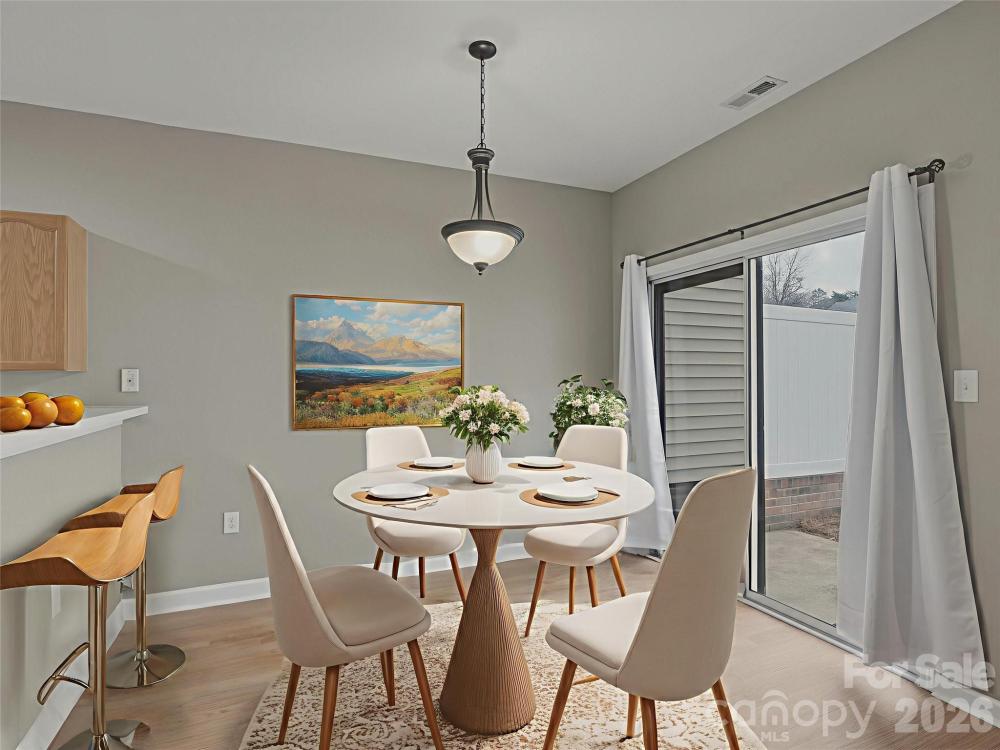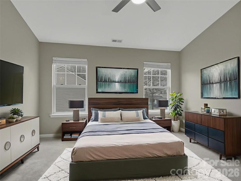 Beautifully maintained 2-bedroom, 2.5-bath townhome with a 1-car garage featuring newly painted concrete floors. Step inside to find brand-new LVP flooring, new carpet, updated light fixtures, and updated door hardware throughout. A sliding glass door with screen opens to the private back patio area. The kitchen offers recently updated countertops, a new dishwasher, and fresh interior paint throughout the home. Vaulted ceilings create a bright, open-concept feel. Upstairs features two separate primary suites, each with its own private bathroom and walk-in closet—ideal for privacy and flexibility. This townhome is truly in excellent condition. The front yard has been recently seeded, providing a great start for a lush, green lawn.