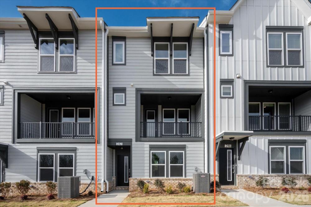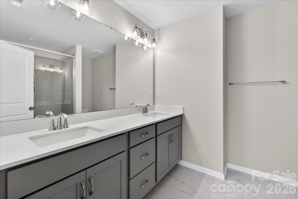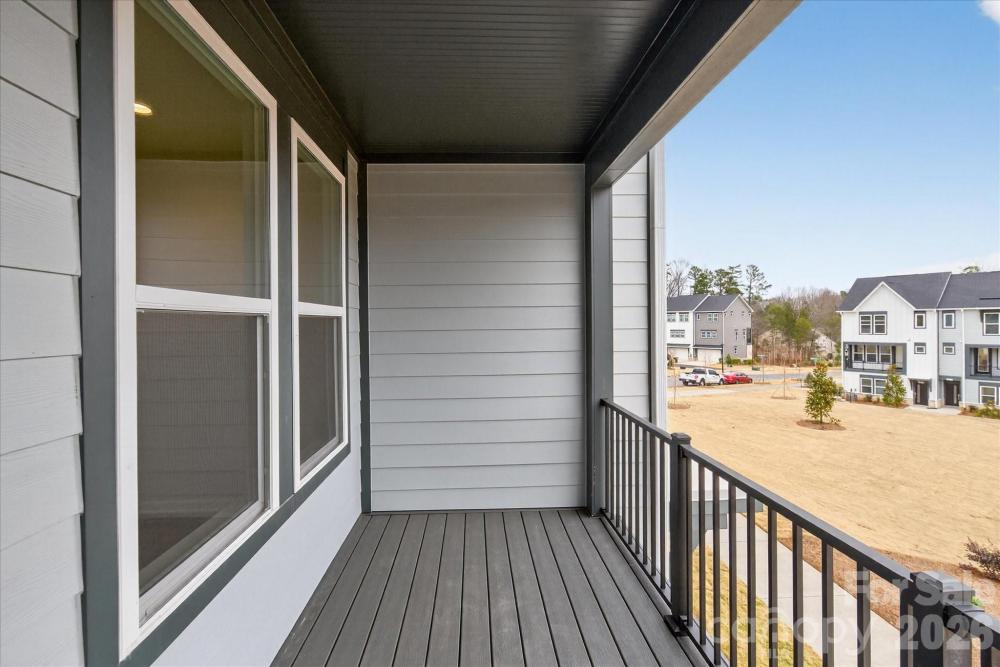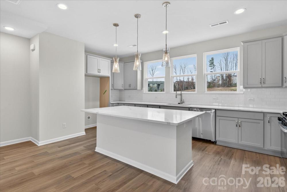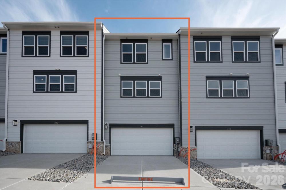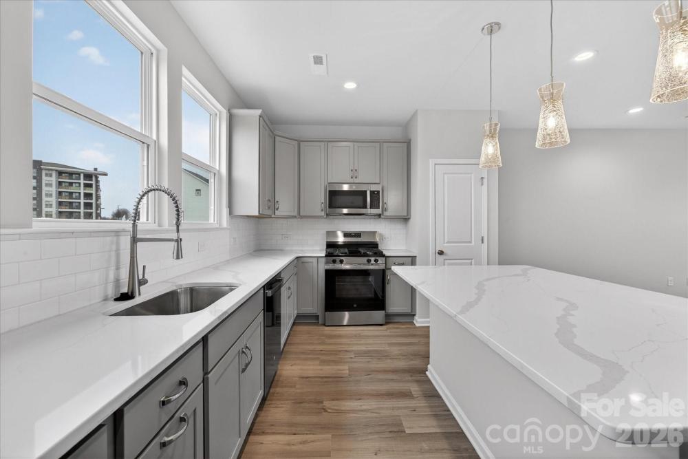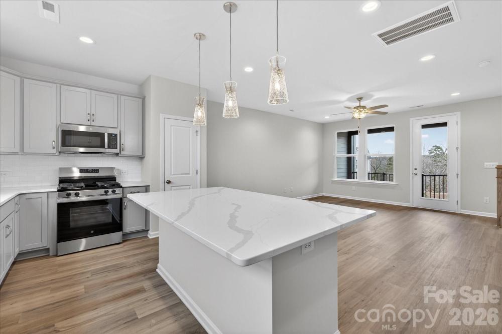 New 3-story townhome in Charlotte's University area, with a private bath in every bedroom. Walk to Toby Creek Greenway, with easy access to the light rail for heading to Uptown Charlotte, South End, and beyond. The first floor has a 2-car garage plus guest bedroom with private bath. Open-concept living on the second floor, with 9' ceilings and a private terrace with green space views and Trex decking. Layout the space with a separate living room and dining area, or you can use the large kitchen island as a dining table, with barstools on both sides. The spacious kitchen boasts 42" grey cabinets, quartz counters, tile backsplash, double pullout trash cabinet, sleek stainless steel Moen faucet, and GE stainless steel appliances with a gas range, plus a pantry closet. The third floor has a laundry closet large enough for a full-sized stacked washer/dryer. Nice sized Primary suite has a walk-in closet and bathroom with large tiled shower. All bathrooms feature quartz counters, grey cabinets, and tiled floors. LVP flooring is at the entry and throughout the second floor, with oak treads on the first set of stairs. Located about 2 miles from UNC Charlotte, Brixton is set back in a quiet location, yet close to everything. Driveway plus on-street parking is included.