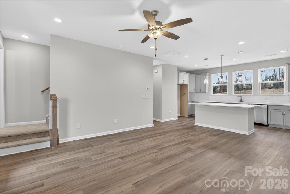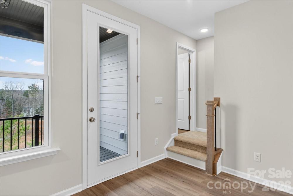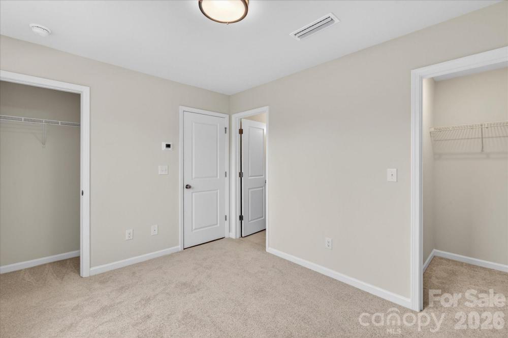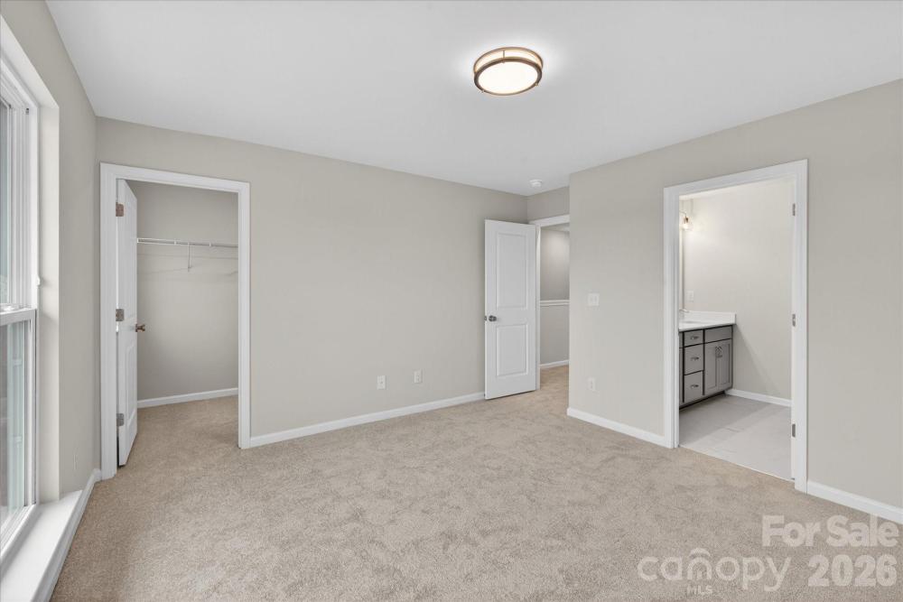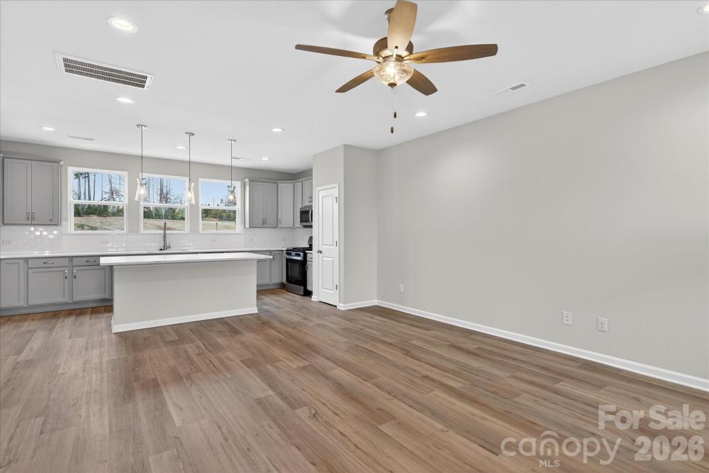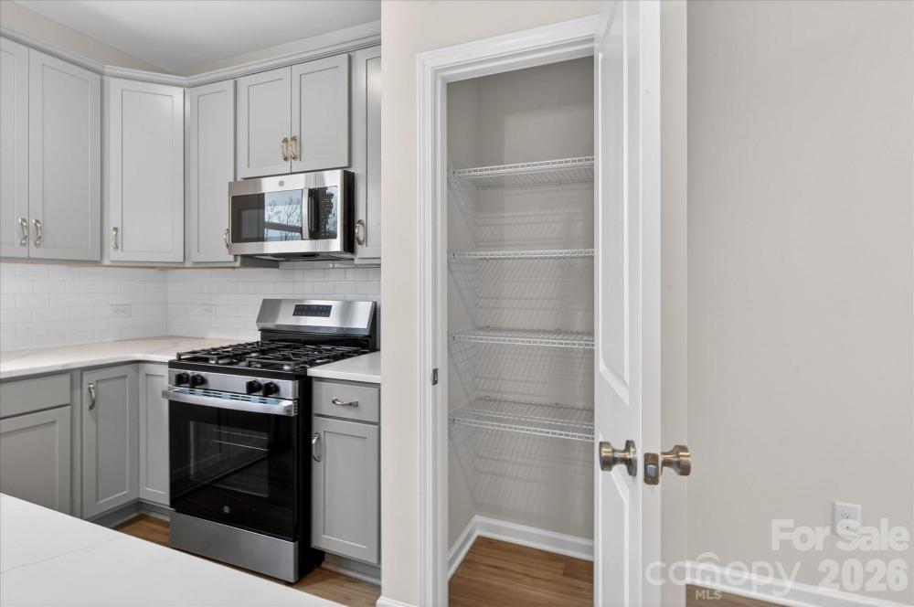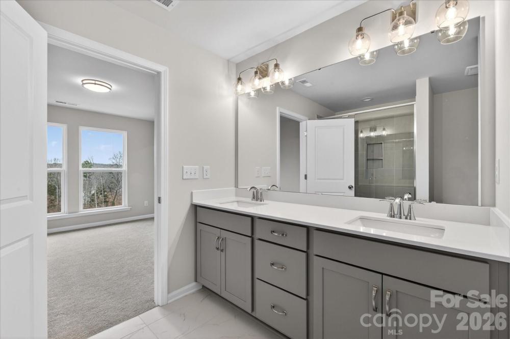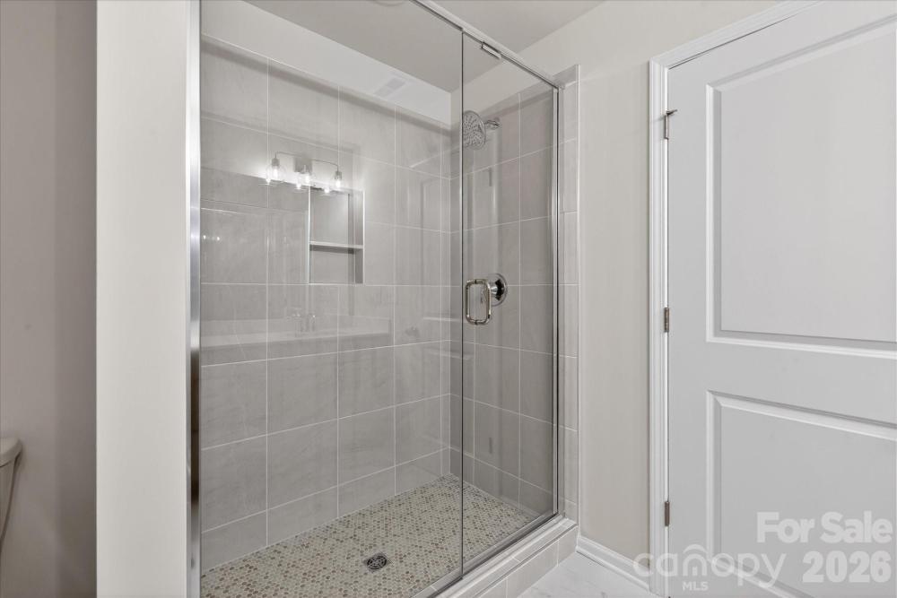 New 3-story townhome in Charlotte's University area, with a private bath in every bedroom. Walk to Toby Creek Greenway, with easy access to the light rail for heading to Uptown Charlotte, South End, and beyond. The first floor has a 2-car garage plus guest bedroom with private bath. Open-concept living on the second floor, with 9' ceilings and a private terrace with green space views and Trex decking. Layout the space with a separate living room and dining area, or you can use the large kitchen island as a dining table, with barstools on both sides. The spacious kitchen boasts 42" grey cabinets, quartz counters, tile backsplash, double pullout trash cabinet, sleek stainless steel Moen faucet, and GE stainless steel appliances with a gas range, plus a pantry closet. The third floor has a laundry closet large enough for a full-sized stacked washer/dryer. Nice sized Primary suite has a walk-in closet and bathroom with large tiled shower. All bathrooms feature quartz counters, grey cabinets, and tiled floors. LVP flooring is at the entry and throughout the second floor, with oak treads on the first set of stairs. Located about 2 miles from UNC Charlotte, Brixton is set back in a quiet location, yet close to everything. Driveway plus on-street parking is included.