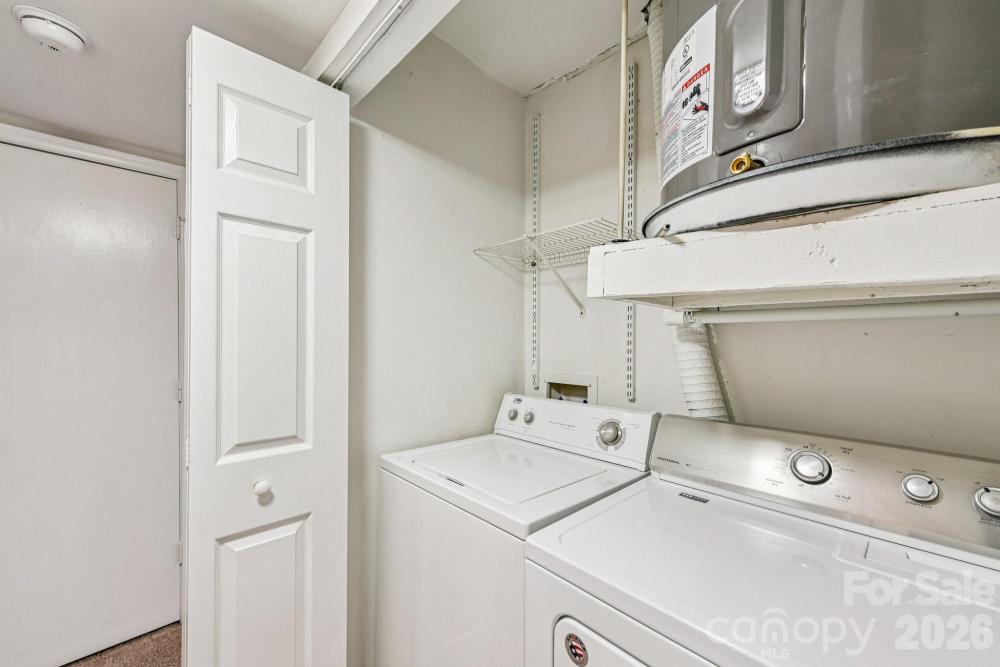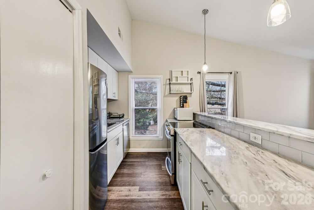 Light-filled end-unit condo in the heart of Myers Park. This 2BR/2BA home offers a bright, open layout with vaulted ceilings, a cozy fireplace, and large windows that bring in abundant natural light. LVP flooring throughout adds a modern, low-maintenance feel. The updated kitchen features granite countertops and stainless steel appliances, flowing seamlessly into the main living space—perfect for everyday living or entertaining. Spacious bedrooms include a private primary suite with walk-in closet and ensuite bath. Enjoy the covered front porch surrounded by mature oak trees. Unbeatable location near shops, restaurants, parks, Queens University, and greenway access, with quick drives to Uptown, SouthPark, the airport, and major medical centers. Low HOA covers water, sewer, exterior maintenance, trash, landscaping, community pool, and parking.