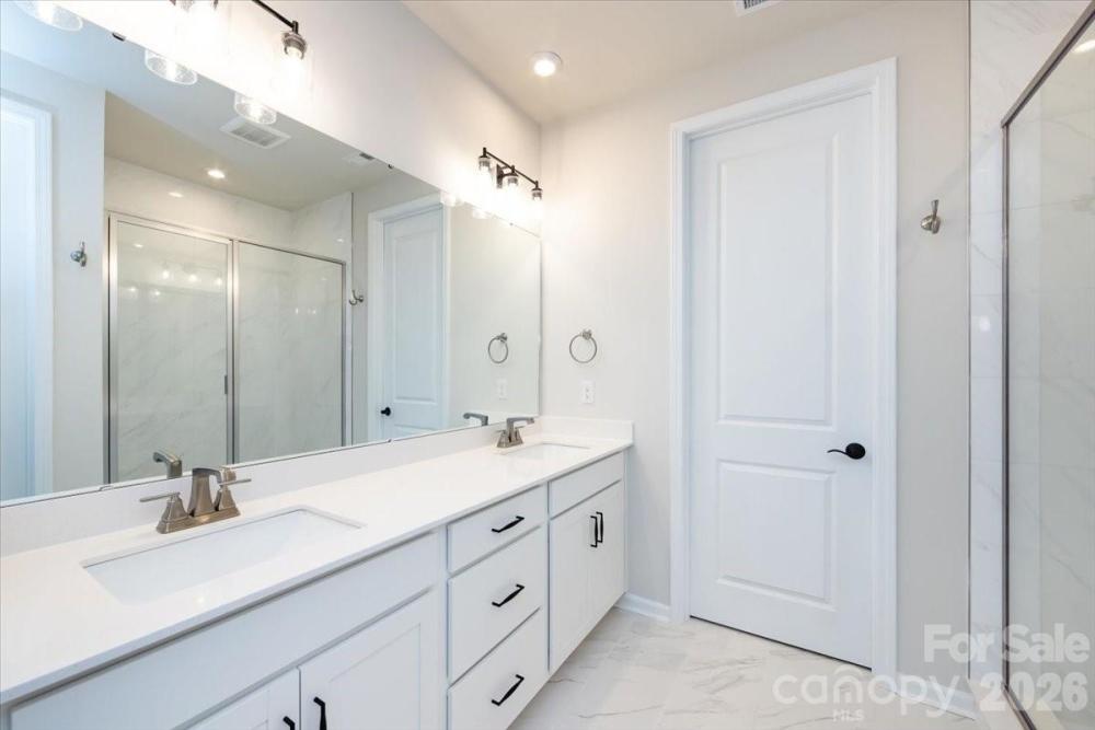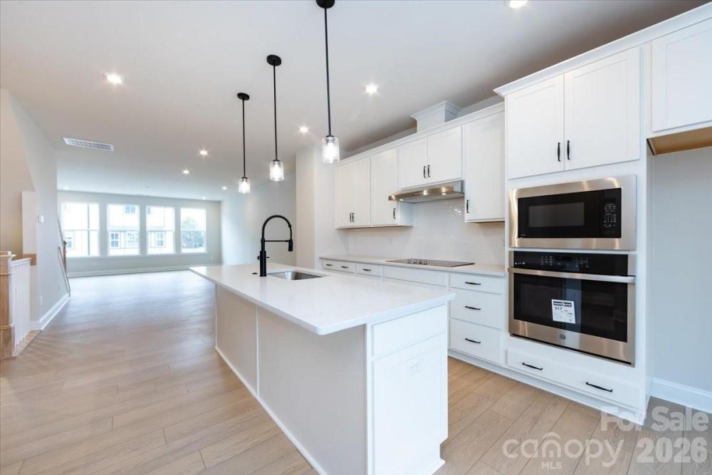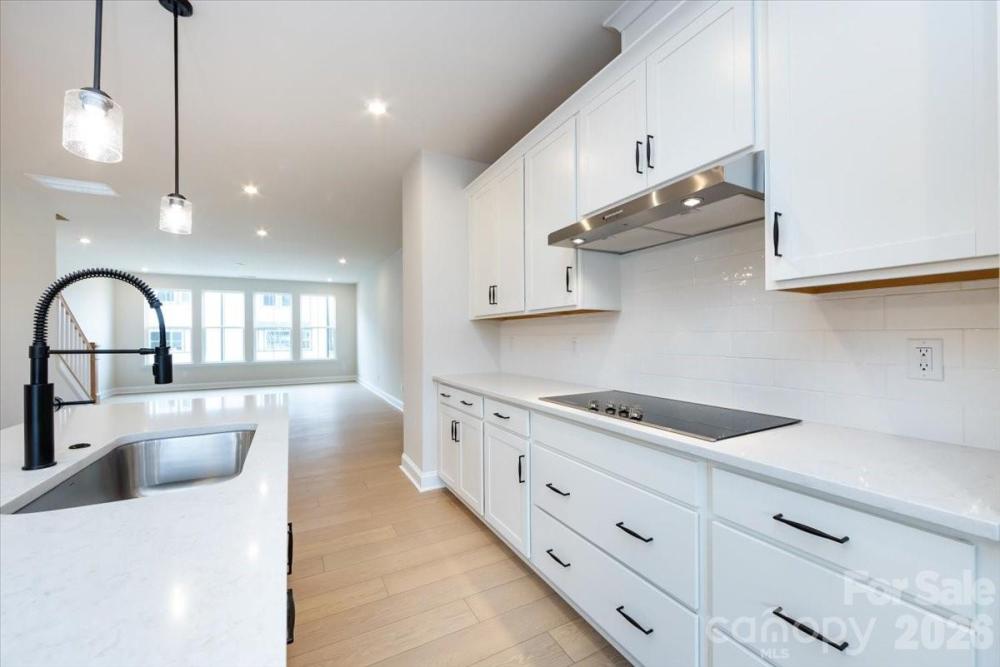 Set at the rear of the Bellflower community with no front neighbors, this Dahlia townhome offers a quiet, private setting near the community dog park. Inside, the gourmet kitchen pairs modern white cabinetry with matte black hardware, quartz countertops, and a Mediterranean-style cream backsplash, creating a space designed for both everyday living and gathering. A first-floor guest bedroom with full bath adds flexibility, while open rail detailing and oak box stairs enhance light and flow throughout the home. The primary suite features a spa-inspired tiled walk-in shower, dual vanity with generous storage, and a calm retreat feel. Rear covered outdoor living, a large walk-in pantry, and extra storage throughout complete this thoughtfully designed home.