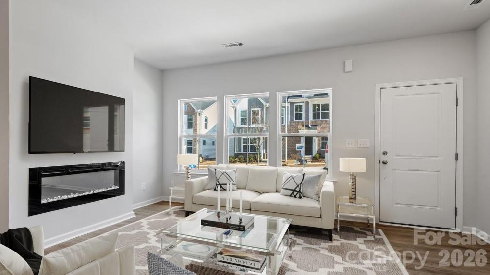 Don't miss this thoughtfully designed end-unit two-story townhome offers three bedrooms and two-and-a-half bathrooms. Just inside the entrance, you'll find an open-concept great room that flows seamlessly into the kitchen and eat-in dining area. Upstairs, the primary suite includes a spacious walk-in closet, with a boxed ceiling and dual vanities for added luxury. Two additional bedrooms and a full bathroom are also located on the second floor, along with a conveniently placed laundry closet just outside the secondary bedrooms. A powder room is located just inside the entry from the attached one-car garage, with a built-in bench and cubby to keep essentials in check.