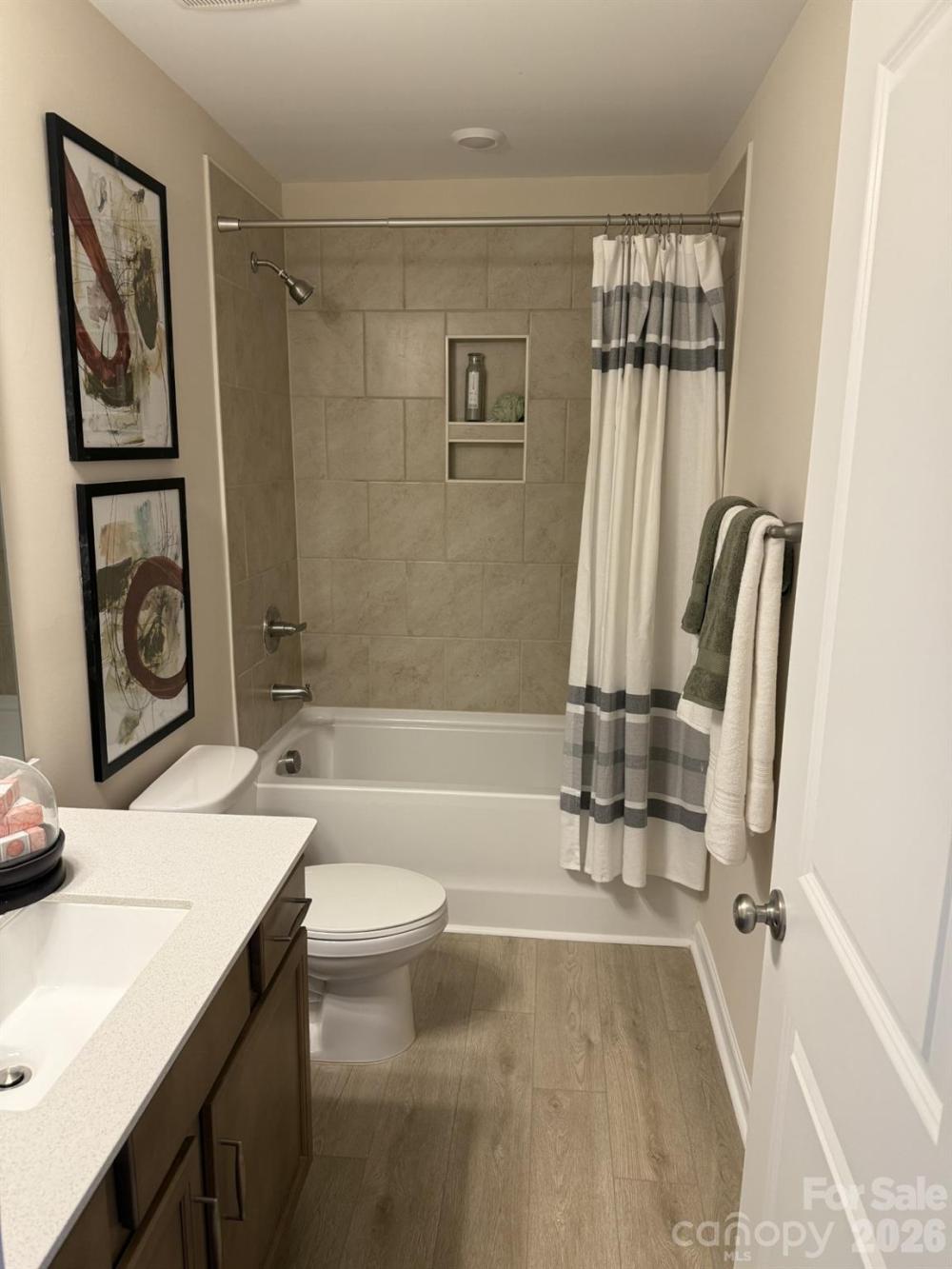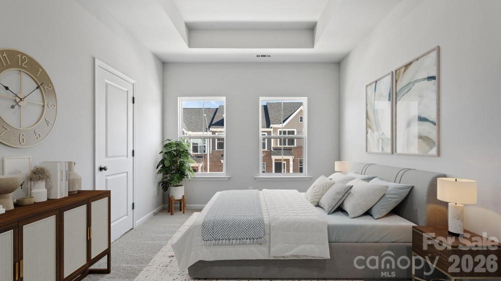 This thoughtfully designed two-story townhome offers three bedrooms and two-and-a-half bathrooms. Just inside the entrance, you'll find an open-concept family room that flows seamlessly into the kitchen and eat-in dining area. Upstairs, the primary suite includes a spacious walk-in closet, with a boxed ceiling and dual vanities for added luxury. Two additional bedrooms and a full bathroom are also located on the second floor, along with a conveniently placed laundry closet just outside the secondary bedrooms. A powder room is located just inside the entry from the attached one-car garage, with a built-in bench and cubby to keep essentials in check.