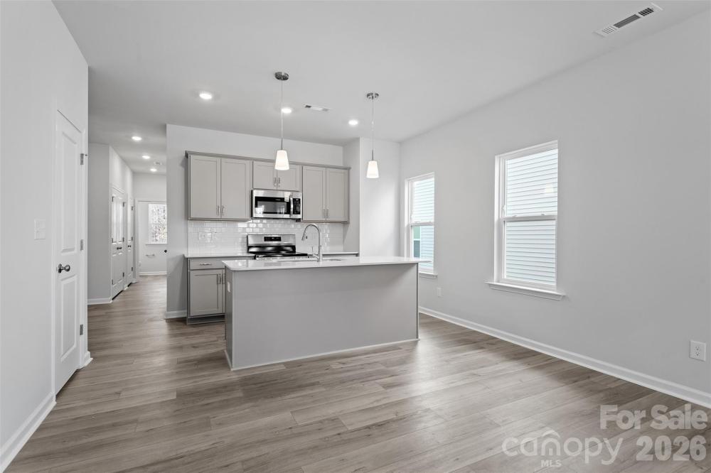 This thoughtfully designed two-story townhome offers three bedrooms and two-and-a-half bathrooms. Just inside the entrance, you'll find an open-concept great room that flows seamlessly into the kitchen and eat-in dining area. Upstairs, the primary suite includes a spacious walk-in closet, with a boxed ceiling and dual vanities for added luxury. Two additional bedrooms and a full bathroom are also located on the second floor, along with a conveniently placed laundry closet just outside the secondary bedrooms. A powder room is located just inside the entry from the attached one-car garage, with a built-in bench and cubby to keep essentials in check.