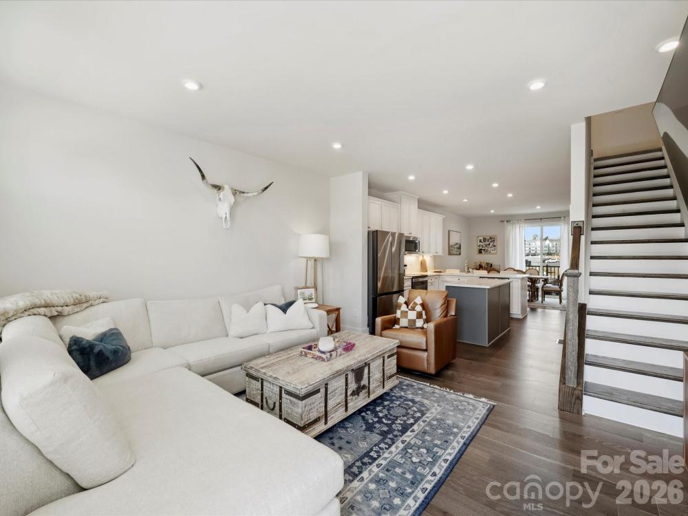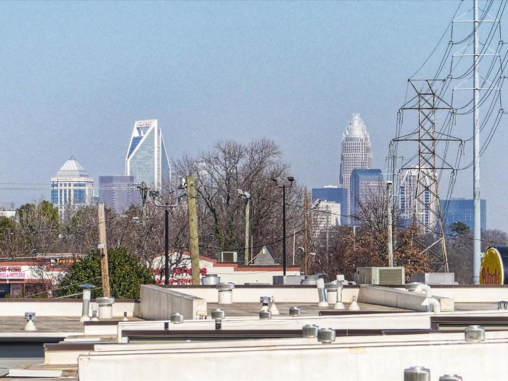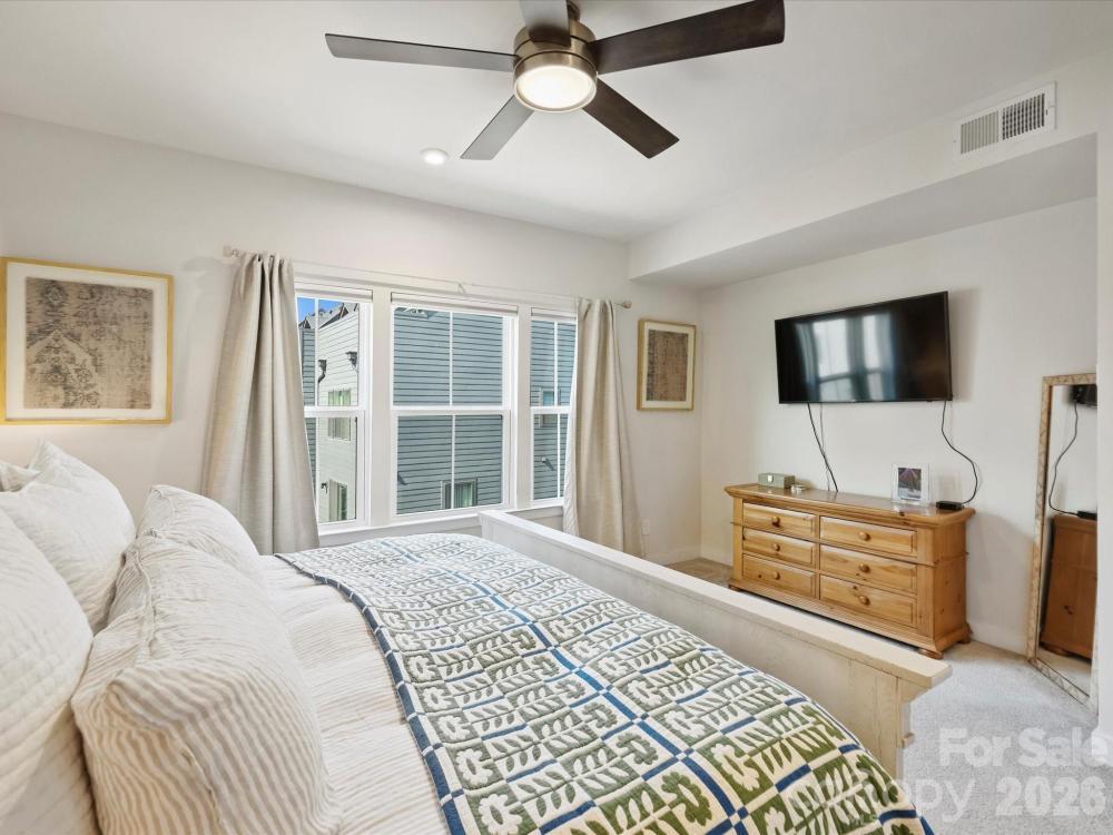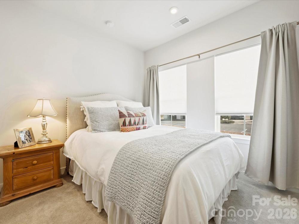 Enter from the street into a spacious living room that flows seamlessly into a chef’s kitchen featuring white cabinetry, quartz countertops, stainless steel appliances. The adjacent dining area opens to a private balcony - perfect for morning coffee or an after-dinner cocktail. Upstairs, the expansive primary suite offers like-new carpet, a tray ceiling with fan, and an oversized walk-in closet. The spa-inspired primary bath features a dual vanity with quartz countertops and a large walk-in shower. A secondary bedroom also includes a walk-in closet and en-suite bath. The top level boasts a rare, true third bedroom with an en-suite full bath, closet, and direct access to the outdoor rooftop terrace—ideal for entertaining or relaxing. Custom window treatments are featured throughout the home. This like-new townhome offers easy access to Charlotte Douglas International Airport and South End, combining modern living with unbeatable convenience.