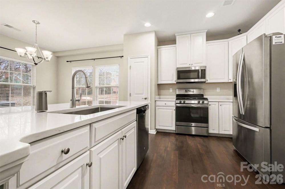 Beautiful end-unit townhome in Bryant Park with 3 bedrooms, 2.5 baths, and a 2-car garage. This one just feels good the second you walk in. Tons of natural sunlight from all the extra end-unit windows makes the entire home feel bright and open. The layout is spacious yet functional, perfect for everyday living and entertaining. The kitchen has been updated with a large island that anchors the space — great for hosting, casual meals, or your morning coffee setup. Upstairs, the primary suite offers generous space, a walk-in closet, and a private bath. Secondary bedrooms are well-sized and versatile for guests, office space, or whatever fits your lifestyle. Step outside to a fenced yard with a comfortable amount of space to relax, entertain, or let pets play. This home has been very well taken care of and it shows. Move-in ready and in a prime location near everything Bryant Park has to offer.
