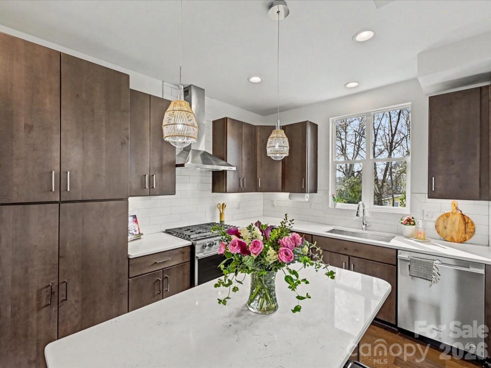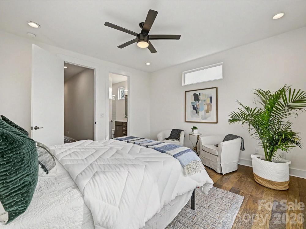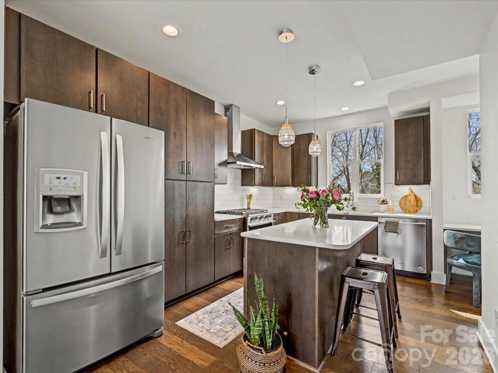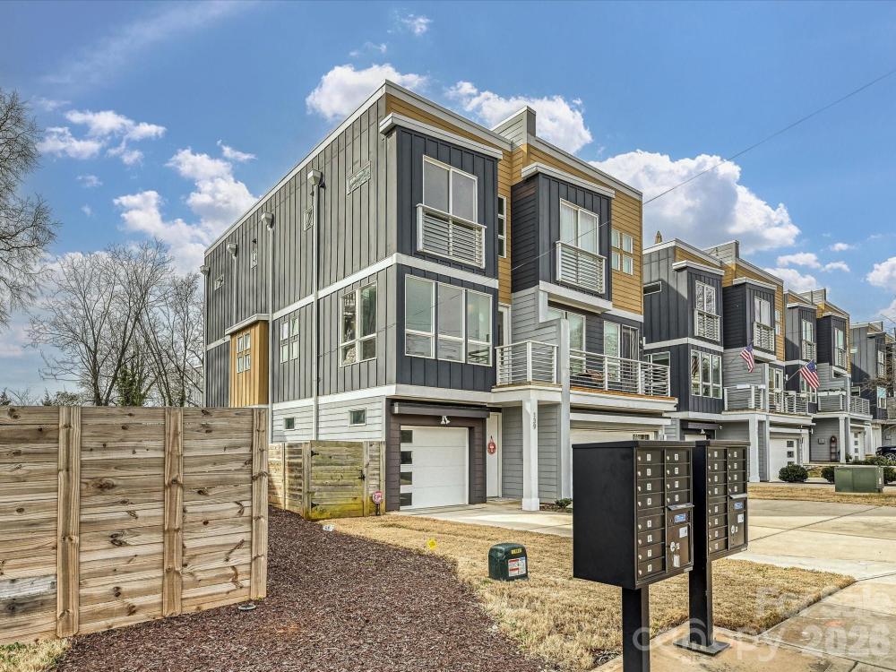 Welcome Home to your unique, modern 4 story townhome with an amazing Roof Top Terrace that boasts skyline vistas, perfect for entertaining or relaxing under the Charlotte sky. This duet style townhome in the coveted Seversville community offering contemporary living just moments from Uptown Charlotte. Open concept layout includes large, upgraded kitchen, dining area & living room with balcony. Kitchen includes SS Appliances, Gas Range, European Style Cabinets & Quartz Countertops. This home features natural light throughout & pre-finished wood floors throughout the entire unit. Main Level also has home office area with desk & window overlooking the backyard. The upper level boasts a spacious primary bedroom. The primary bathroom includes large tile shower, dual sink vanity & walk-in closet. The secondary bedroom has an upgraded full bath and sliding door open to outside. Enjoy grilling with connected gas line or relax watching tv on the rooftop terrace. 2 car tandem garage is oversized, with storage closet and access to fenced backyard.