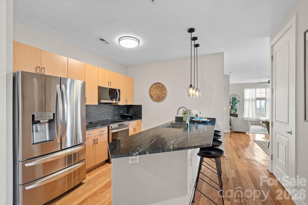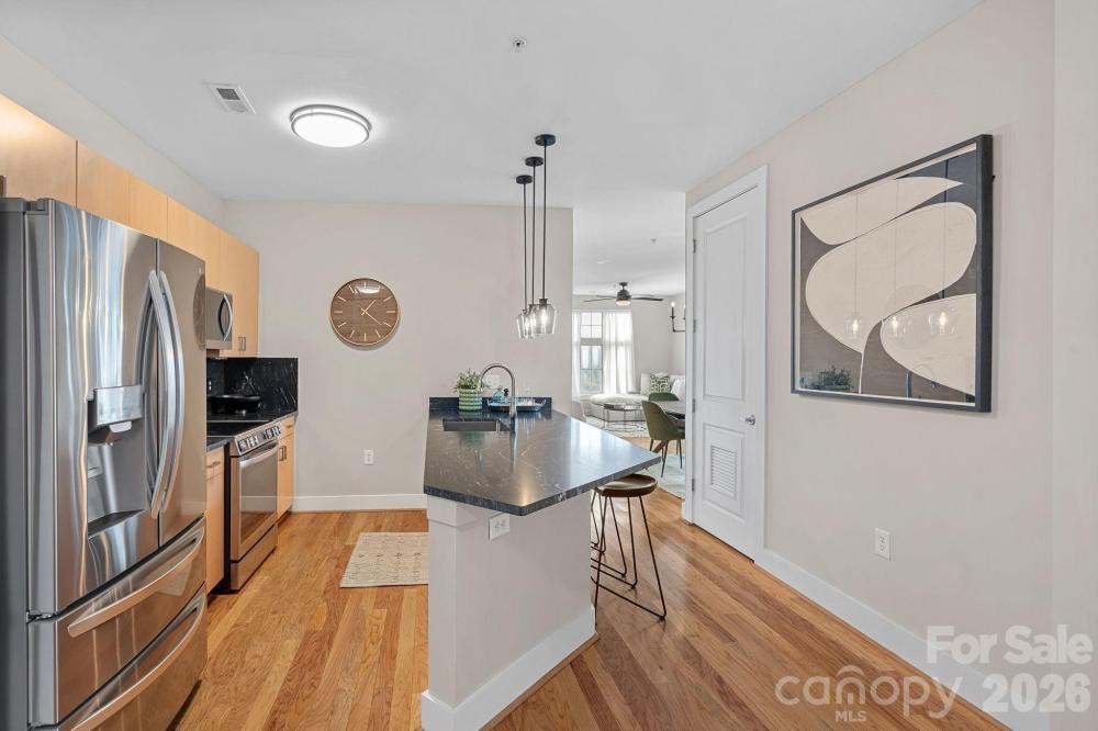 In the heart of 3rd Ward and truly walkable to Uptown, this 2-bedroom, 2-bath corner condo puts the city at your doorstep. Catch a Panthers, Charlotte FC or Knights game, hit the greenway, grab coffee or dinner, all without moving your car. When you’re ready to slow it down, come home to a space that feels bright, open, and easy. New lighting throughout and an updated kitchen with new countertops and appliances give it a fresh, modern look that flows seamlessly into the living area. Large windows bring in natural light and the covered balcony is the perfect spot to start or end your day. The mature trees lining the edge create a peaceful retreat just minutes from the energy of Uptown. Both bedrooms feature new carpet for a clean, comfortable finish. The interior courtyard offers grills and seating areas with skyline views peeking over the building. Frazier Park, with a playground, dog park, walking trails, tennis and basketball courts, sits right next door. Secure elevator building with key fob access and gated garage parking, including one assigned space. Fully move-in ready with the refrigerator, washer, and dryer included. A rare chance to get location, updates, and true walkability all in one.