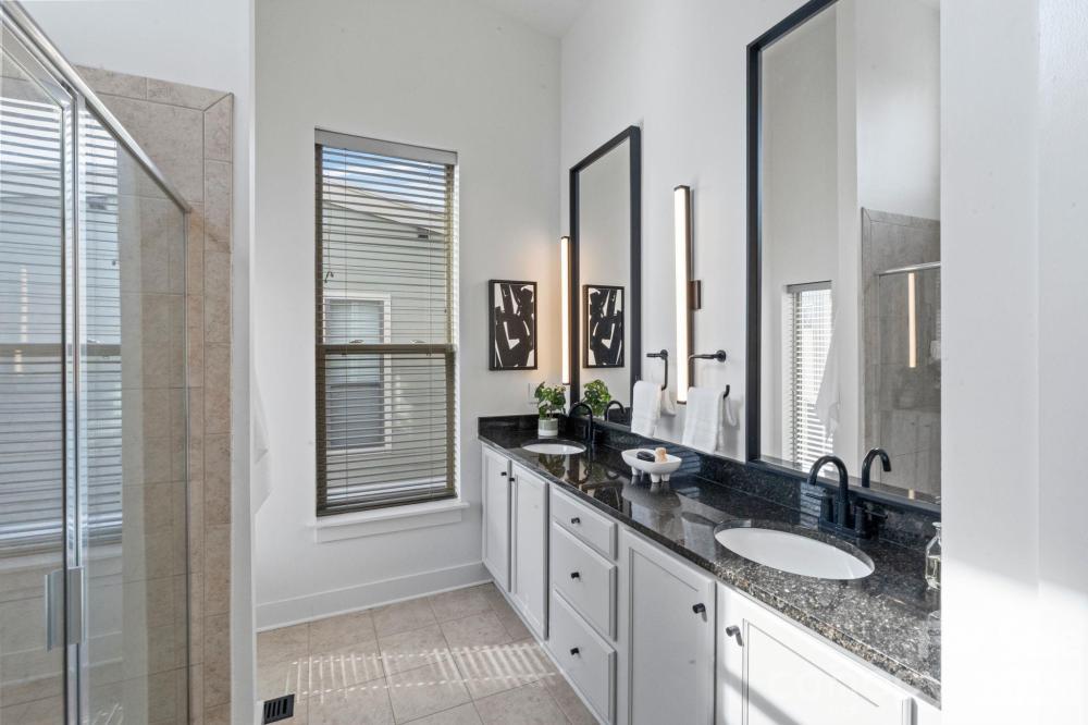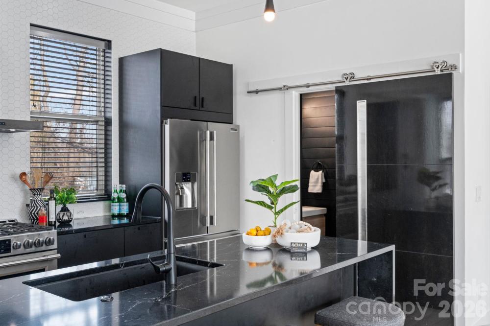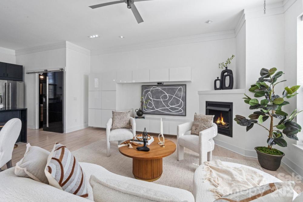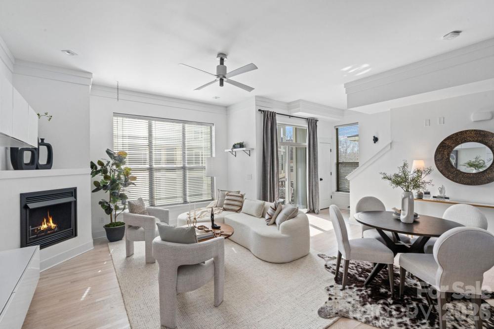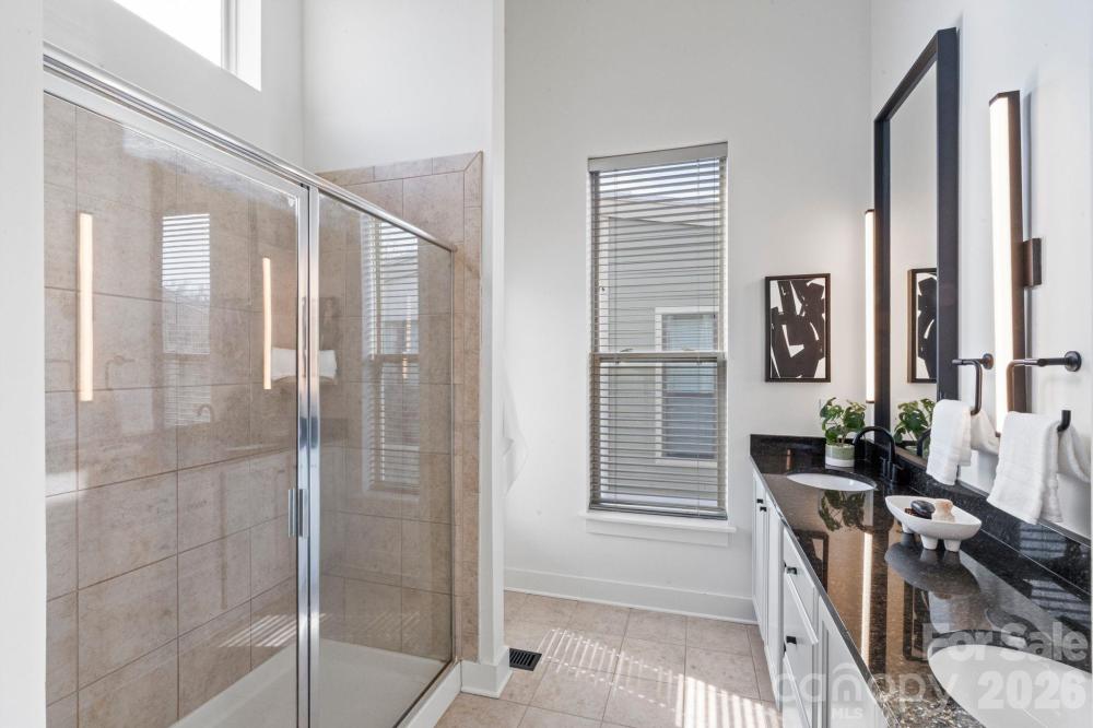 Beautifully updated end-unit townhome in Steel Gardens, offering stylish upgrades and abundant natural light. Thoughtfully renovated with modern design touches throughout, this home features an open-concept living space centered around a sleek kitchen with black quartz countertops, stainless steel appliances, and a striking waterfall island that anchors the space. The living area is enhanced by soaring ceilings and a custom built-in media center with generous storage, creating both function and visual appeal. The main level includes access to the two-car garage and inviting outdoor spaces, including a private back patio and cozy balcony - perfect for relaxing or entertaining. Upstairs, both bedrooms feature en-suite bathrooms, recently refreshed with new paint and mirrors, along with a conveniently located laundry area. This end-unit position provides added privacy with no homes directly in front or behind, thanks to a large greenspace and guest parking area. Located just moments from the heart of NoDa, you'll enjoy easy access to some of Charlotte’s best restaurants, breweries, galleries, music venues, and neighborhood hotspots.