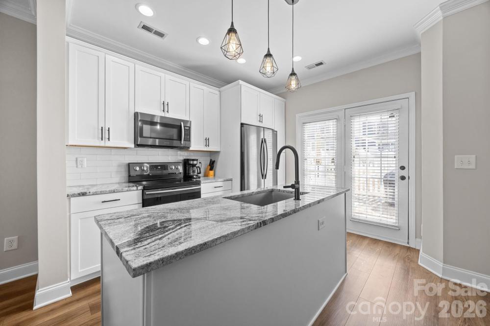 Charming 2-bedroom townhome in the highly desirable Wesley Heights neighborhood. Bright, open floor plan with 9-foot ceilings and beautiful LVP flooring throughout the main level. Spacious great room with built-in shelving and a custom bar featuring a granite countertop and beverage cooler—perfect for entertaining. The space flows easily into the dining area and updated kitchen featuring soft-close shaker cabinets, granite countertops, black and stainless steel appliances, center island with bar seating, and pantry. Upstairs, the primary suite offers vaulted ceilings, a walk-in closet, and updated bath with dual vanities. The secondary bathroom has also been updated with a granite-topped vanity and ceramic tile flooring. A second bedroom and convenient laundry closet complete the upper level. Enjoy outdoor living with both a covered front porch and private fenced back patio—ideal for relaxing or entertaining. Fantastic Wesley Heights location just steps from the Stewart Creek Greenway and a short walk to Bank of America Stadium, Uptown restaurants, breweries, and Frazier Park. Easy access to I-77 and I-277.