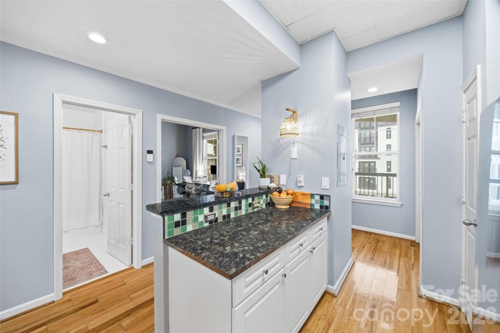 This beautifully updated 2-bedroom, 2-bathroom condo in the Park Plaza building offers a bright, open floor plan with thoughtful upgrades throughout. The kitchen features updated appliances including a microwave, gas stove, refrigerator, and in-unit washer and dryer for added convenience. Both bathrooms have been renovated, with the primary bathroom showcasing new floor tile, refreshed vanity paint, updated lighting, and electrical work completed to accommodate a modern LED mirror, while the secondary bathroom features a new vanity, mirror, light fixture, and fresh paint. Additional improvements include a new ceiling fan in the living room and updated finishes throughout. Step onto your private balcony and take in some of the best skyline views Uptown has to offer, while also enjoying the convenience of easy, accessible private parking. Ideally located in the heart of Uptown Charlotte, this home is just steps from Harris Teeter and Fourth Ward Park, with Blumenthal Performing Arts Center, Truist Field, Bank of America Stadium, First Ward Park, Little Sugar Creek Greenway, and the 7th Street LYNX light rail station all nearby, offering exceptional walkability and easy commuting.
