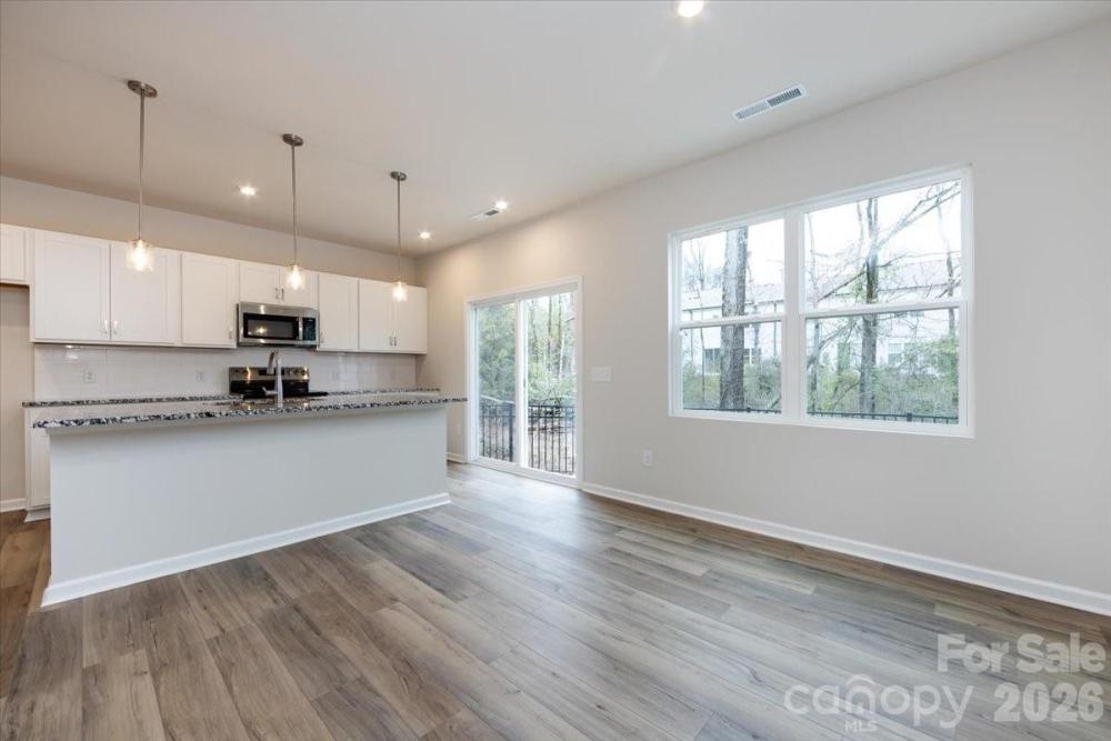 At 6001 Longar Lane, the Hanover plan at Fifteen 15 Cannon offers a lifestyle that feels both connected and quietly tucked away. As an end unit, added windows bring in abundant natural light, creating bright, uplifting spaces throughout the day. The first floor is wrapped in exceptionally durable, easy to clean resilient vinyl flooring in a driftwood tone, blending style with everyday practicality. The chef inspired kitchen anchors the main living area, designed for gathering and conversation, while an extended 6' x 12' sliding glass door opens seamlessly to the outdoors, expanding your living space for relaxed evenings or weekend entertaining. The home backs to a wooded area adding to your privacy. Upstairs, the primary suite features a dual vanity with white cabinetry and white quartz countertops, delivering a fresh, clean look that feels timeless. Living in Fifteen 15 Cannon means enjoying mature tree lined streets, community greenspaces, and walking paths, all just minutes from Uptown, NoDa, Camp North End, and the airport, giving you the best of Charlotte with a setting that feels like your own retreat.