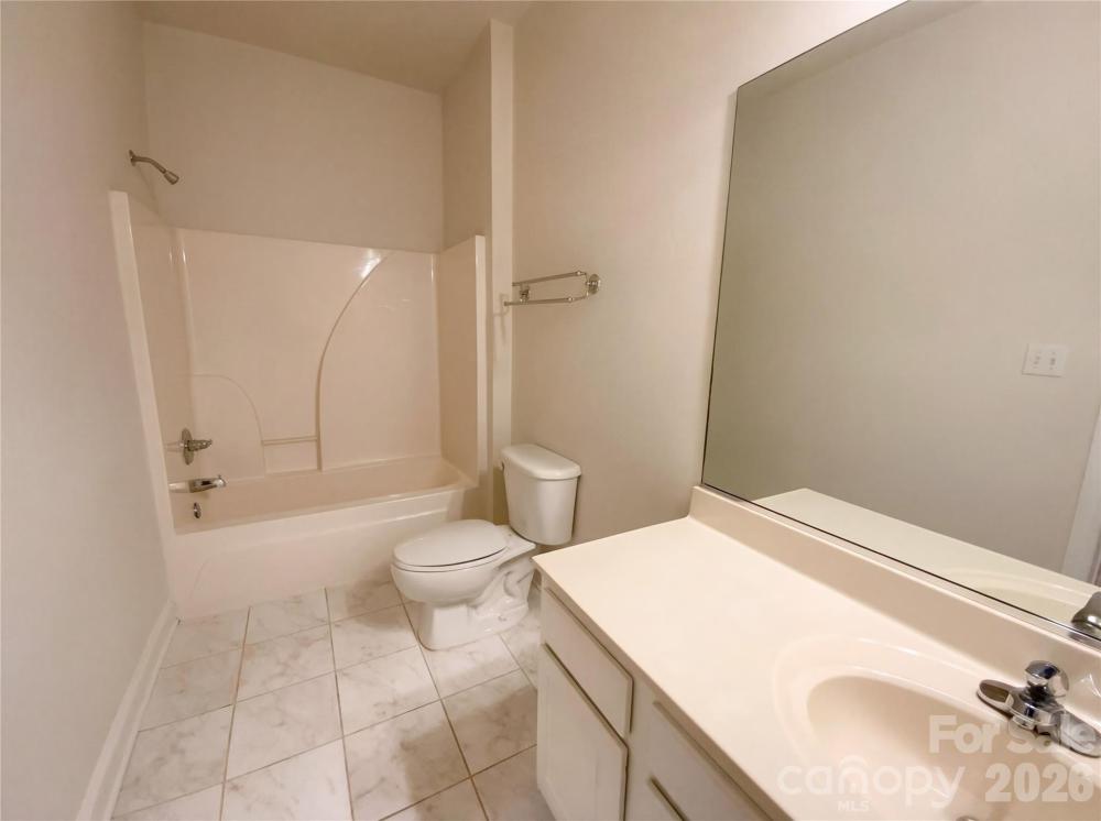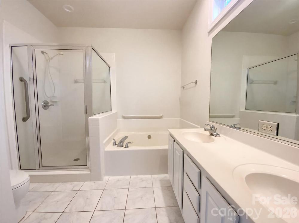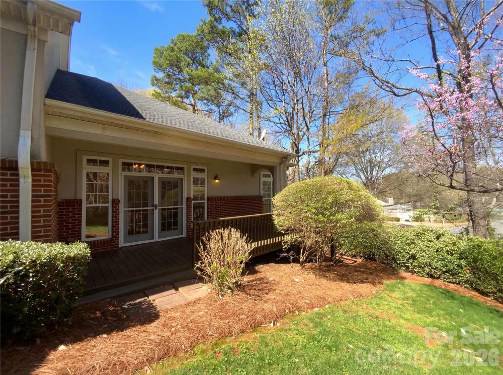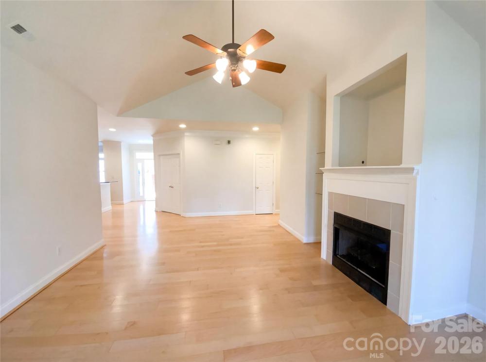 The vaulted ceilings define the character of 8820 Legacy Lake Ln. The layout includes an accent backsplash in the kitchen, a fireplace, double sinks in the primary bathroom, and a separate tub and shower in the primary bathroom. The building materials consist of stone, tile, and hardwood surfaces. This structure maintains a consistent design aesthetic throughout the interior and exterior areas of the entire property. Included 100-Day Home Warranty with buyer activation