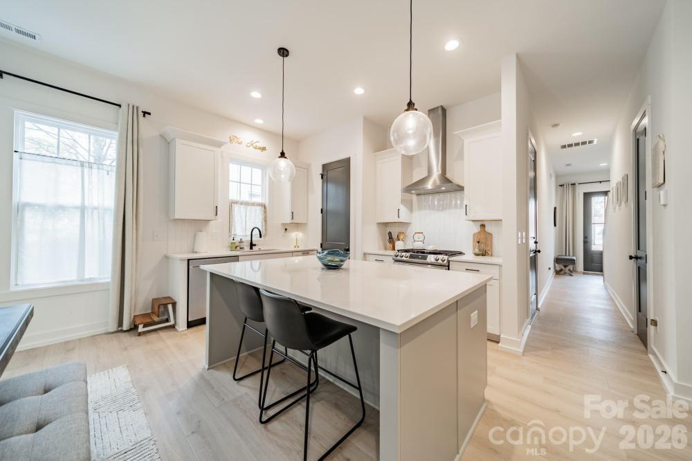 Move in ready townhome built in 2024 with stunning views of Uptown Charlottes skyline! This well maintained inviting home welcomes you through the foyer into an open-concept floor plan featuring a kitchen with a spacious island, ideal for entertaining. Just off the kitchen you will find the dining area and family room with a cozy fireplace, overlooking the outdoor patio and a generously sized backyard complete with a storage shed. Upstairs, the large primary suite offers an oversized walk-in closet with abundant shelving and storage, along with a spa-like primary bathroom featuring a walk-in shower. Two additional guest suites, a full guest bath, and a convenient laundry closet with a full-size washer and dryer to complete the upper level. Enjoy spectacular skyline views just minutes from Uptown Charlotte and Bank of America Stadium. This home is an entertainer’s dream, don’t miss the opportunity to see it in person!