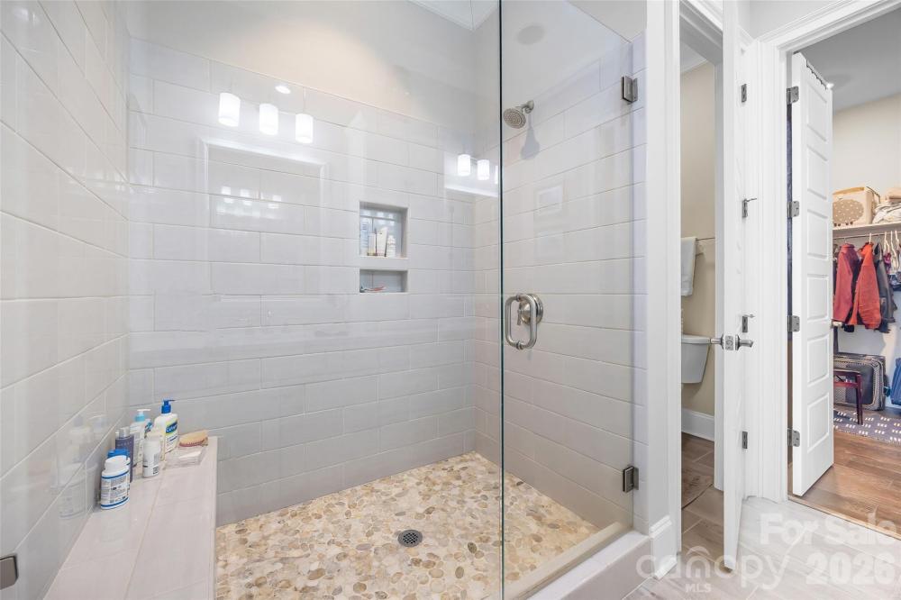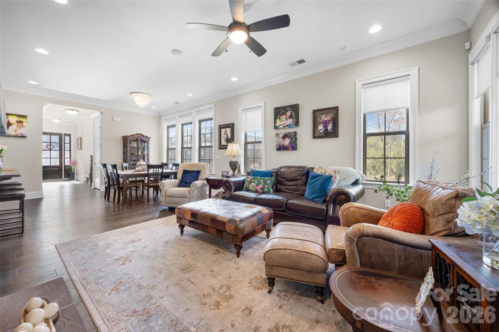 Beautiful, bright, and exceptionally quiet end-unit townhome with painted brick exterior and a rare private side and rear yard. Surrounded by trees and featuring a covered back porch, this home offers the privacy and feel of a single-family residence with the ease of low-maintenance townhome living. The porch is enhanced with motorized screens, allowing you to comfortably enjoy the outdoor space with added privacy and protection. The main level features 10-foot ceilings, heavy crown molding, thick baseboards, and abundant hardwood floors. The spacious Great Room includes a stone fireplace, built-in media cabinetry, and integrated speakers. The kitchen is thoughtfully designed with stacked-to-the-ceiling cabinetry, a large quartz island with apron-front sink, stainless steel appliances, 36-inch gas cooktop, wall oven, and built-in microwave/convection oven. The first-floor Owner’s Suite offers hardwood floors and a tray ceiling, creating a comfortable and private retreat. The Owner’s Bath includes a large tiled shower, double-sink vanity, and a walk-in closet with built-in shelving. A first-floor laundry room adds everyday convenience. Upstairs, 9-foot ceilings and a generously sized Rec Room with hardwood floors provide flexible space for guests, hobbies, or additional living areas. Tile flooring is featured in all full baths and the laundry room. Located just minutes from Quail Corners and Southpark shopping and dining, this home combines convenience with a peaceful setting. HOA dues include all exterior maintenance, irrigation water and landscape lighting, allowing for easy living and beautifully maintained surroundings. An ideal option for those looking to downsize while maintaining space, quality finishes, and privacy.