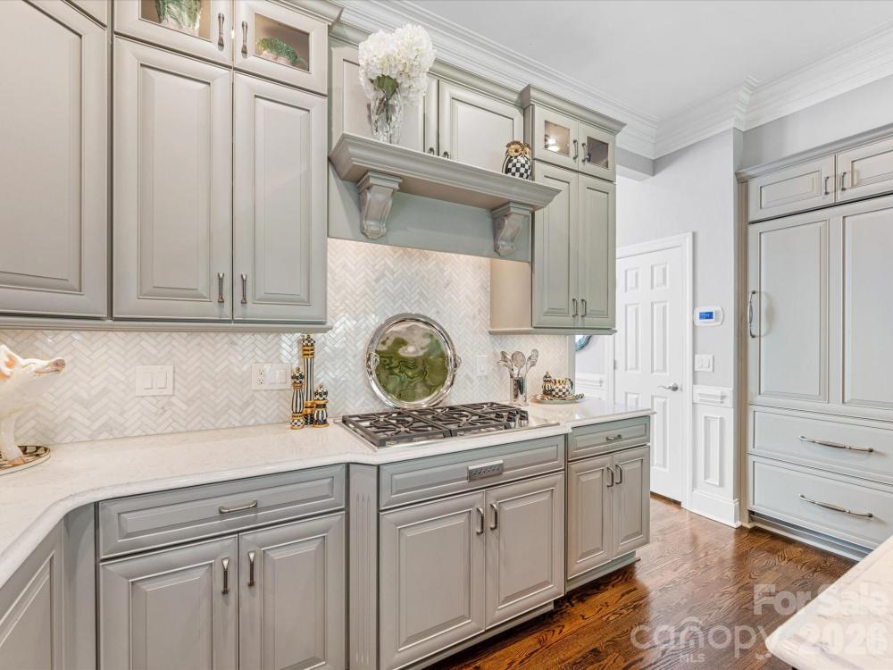 This beautiful home is a hidden gem in the gated community of Burning Tree. This is one of the very few end unit townhomes in the neighborhood with a private back yard and views of the Carmel County Club golf course. If you want privacy and plenty of space for relaxing or entertaining, then this is the home for you. The current owner did a full kitchen remodel with custom cabinetry, quartz countertops, marble backsplash and luxury appliances including Sub Zero refridgerator/freezer, Wolf gas cooktop and downdraft, 2 Jenn Air wall ovens, Miele dishwasher, Sharp Microwave drawer and hidden spice racks in the molding. Kitchen Island has hidden cabinetry on all sides. Custom molding in all rooms including raised paneled wainscotting and crown and base molding throughout. Spacious Primary bedroom en suite on the main floor with 2 walk-in closets and seating area. Primary bedroom has french doors that open to the covered porch on the main level. Covered porch overlooks the golf course in the winter and is completely shaded with trees the remainder of the year. The main level also has a 2 story Dining Room, Formal Living Room, Open Family Room with bar, Breakfast Area with built-in banquette, Laundry room and 2 car garage with rubber flooring. Upstairs is a large Media/Bonus Room with a wet bar and dishwasher. 2 bedrooms upstairs with 2 full baths and an office with closet. Basement level has 2 more bedrooms, a full bath and large Bonus Room with bar and mini fridge. Basement opens to a large private covered patio overlooking a beautiful array of hydrangeas. Tons of storage on the 3rd floor and basement level. Current homeowner has installed HVACs and a Tankless water heater. The gated community has 2 entrances and exits, an outdoor pool, sidewalks, street lights and includes lawn maintenance. This property includes in-ground irrigation, in home security system and an in-ground gas line for a grill on the covered deck.