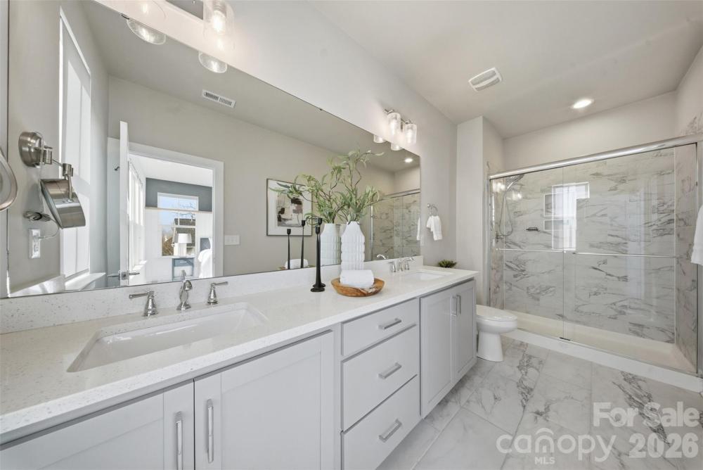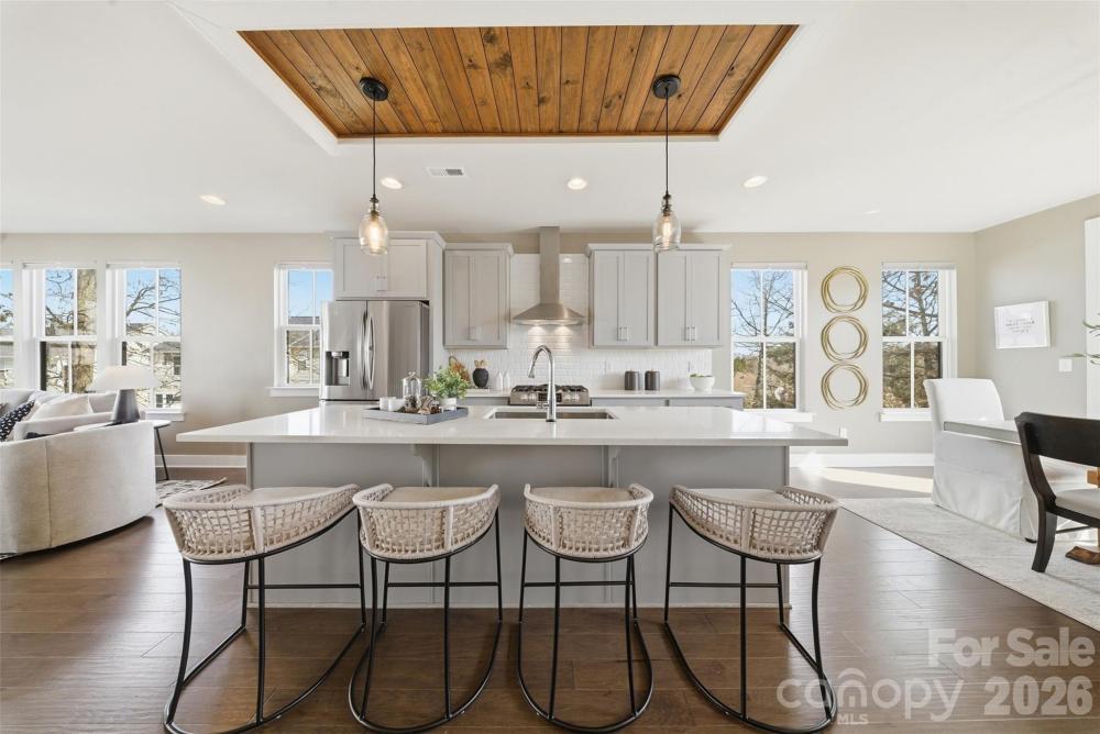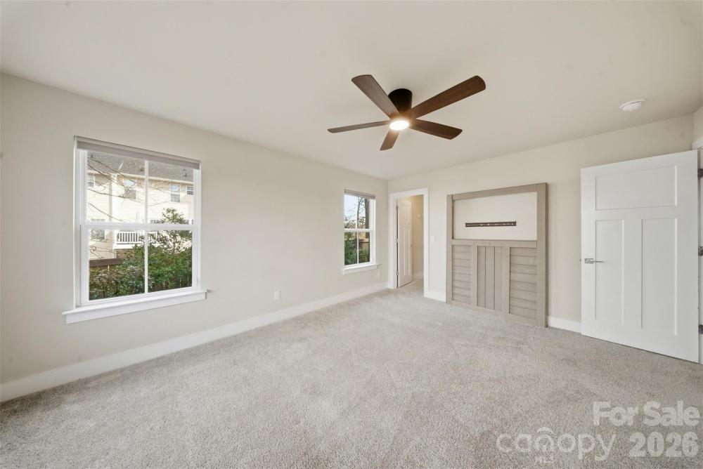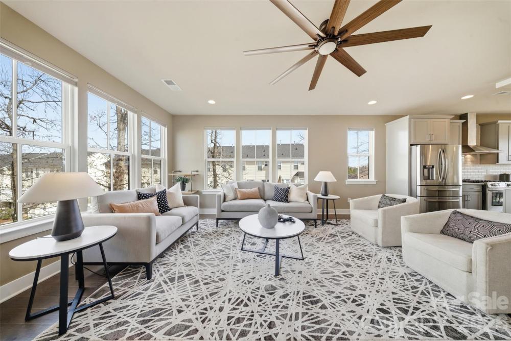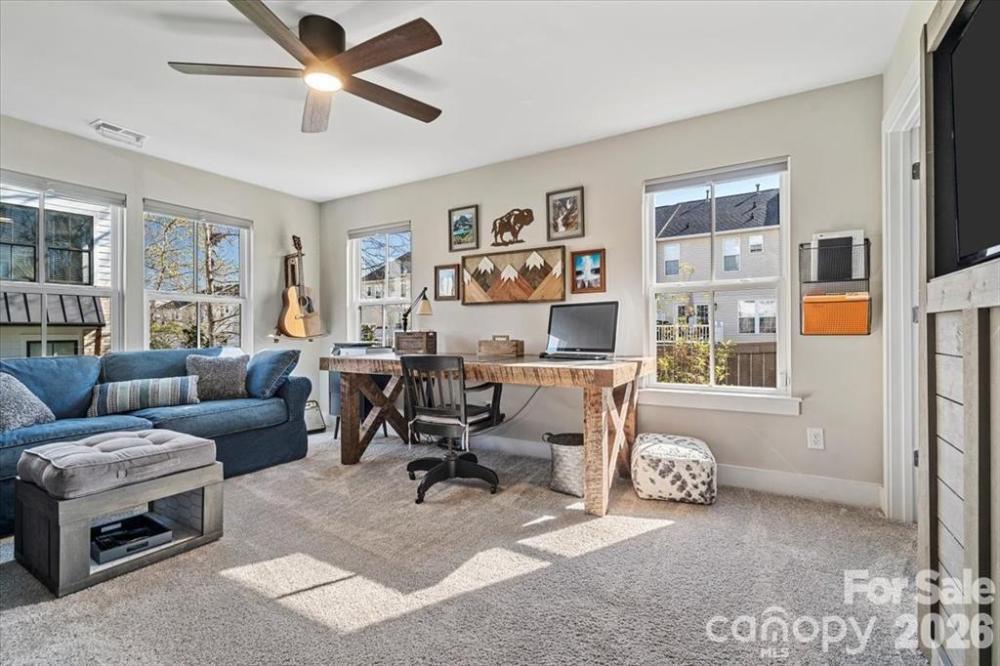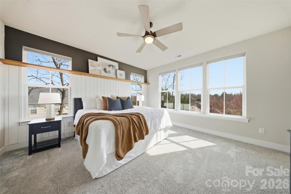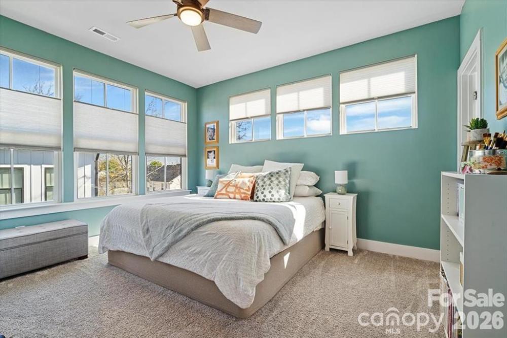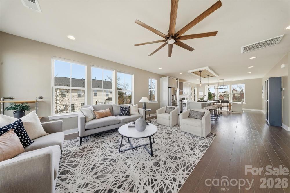 END UNIT townhome with attached 2 car garage and ROOFTOP balcony with spectacular sunrise/sunset views. Appreciate a home with natural light? Look no further. This thoughtful design offers expansive windows that flood the open floorplan with natural light. The home features 3 bedrooms, 3 full and two half bathrooms, and a spacious bonus room. Elegant 5” hardwood floors span the foyer, great room, kitchen, dining area, walk in pantry and powder room. Custom craftsmanship details add an additional layer of luxury. Main level bedroom offers flexible options as private space for home office, exercise or guest suite. Ideally located in sought-after South Charlotte near Ballantyne and Stonecrest, this home offers the perfect balance of convenience and lifestyle. Enjoy walkable access to premier shopping, dining, fitness, lawn maintenance and everyday essentials while coming home to a quiet residential setting. Lifestyle and Location align perfectly at Elm Terraces.