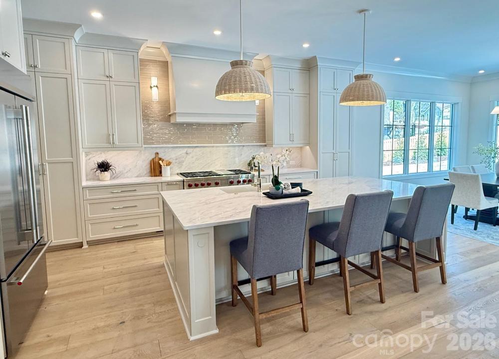 Beautifully built custom home tucked away in the established Mammoth Oaks community overlooking community lake. This executive property sits on a half acre with a swimming pool/spa and is perfect for entertaining. The open floor plan has 10'ceilings on the main and 9'ceilings upstairs. The custom chef's kitchen includes a large island, custom cabinetry, SS appliances including a 48" Wolf gas range and a walk-in hidden pantry/scullery. The dining area is perfect for every day use as well as more formal dining. The primary bedroom is on the 1st floor with view of pool and primary bath with heated tile flooring. Upstairs you will find 4 additional bedrooms, a flex room, large landing & 2 bonus room spaces. The home is Energy Star Certified, has maintenance free Low-e insulated Pella aluminum clad windows, tankless water heater w/recirculation loop, multi-zoned HVAC w/ gas furnace, 7.5"white oak engineered hardwood floors throughout the entire home. Home also has 3 car garage, custom drop zone with lockers and laundry room. Designer tile in laundry and all bathrooms. Mammoth Oaks is located in south Charlotte convenient to Uptown, South Park and Strawberry Hill shopping and restaurants. Also conveniently located to Providence Day, Country Day schools.