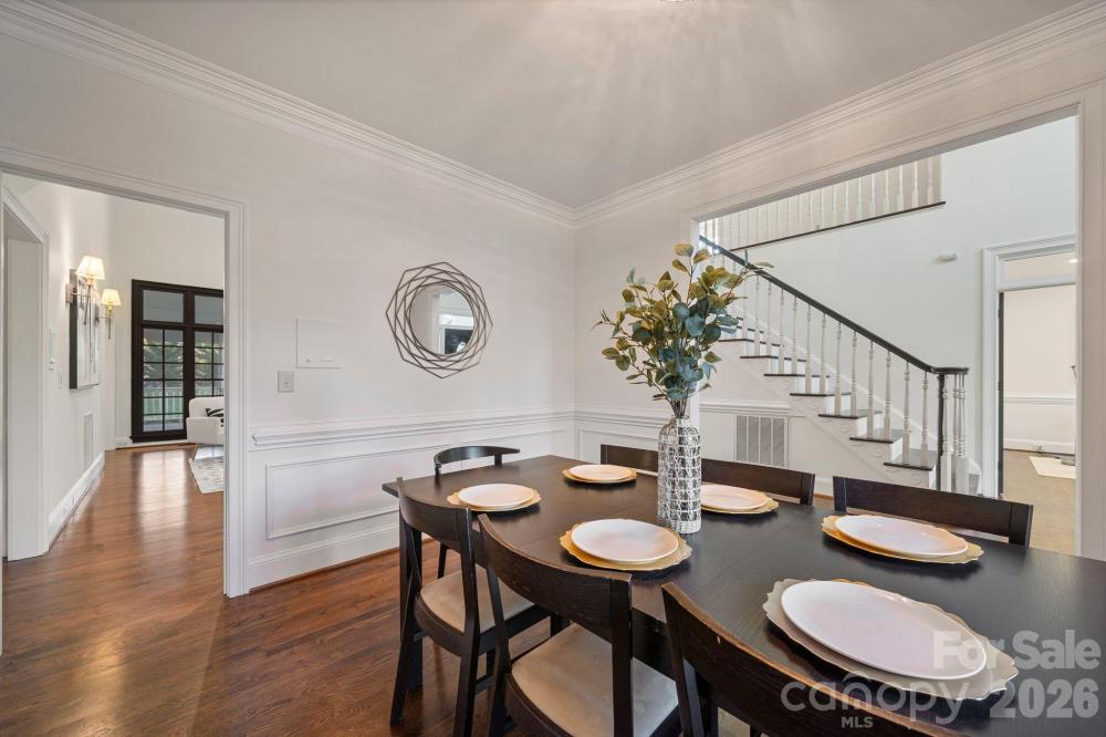 Elegant all brick two-story home with timeless curb appeal, nestled on a peaceful, tree-lined street in the heart of Providence Country Club. A stately entry porch welcomes you inside to a light-filled interior where rich hardwood floors, fresh neutral paint, classic trim work, and abundant windows create a warm and inviting atmosphere from the moment you enter the home. Designed for both gathering and quiet moments, the home features a formal dining room perfect for holidays and celebrations, along with a dedicated office that offers a peaceful retreat for work or study. The heart of the home—the kitchen—opens to a sunny breakfast area with picture windows and access to the screened-in porch, where mornings begin with coffee and evenings wind down overlooking the private, tree-lined yard. The spacious great room, with soaring two-story windows, vaulted ceilings, custom built-ins, and a gas fireplace, offers a welcoming place to gather with family and friends. Enjoy the rare convenience of being able to walk to Providence Country Club and to Waverly for dinner, shopping, or community events. Located in a sought-after school district and just minutes from Waverly, Blakeney, and Ballantyne, with easy access to I-485, Uptown, and the airport, this home combines warmth, functionality, and an unbeatable location. Filled with natural light and thoughtfully cared for, this home is ready for its next chapter.
