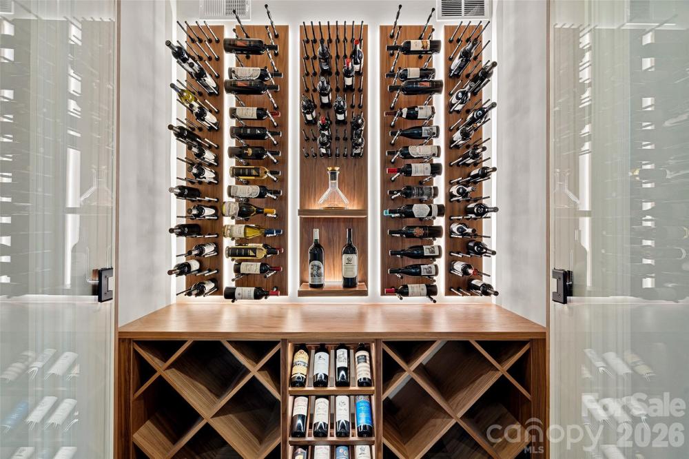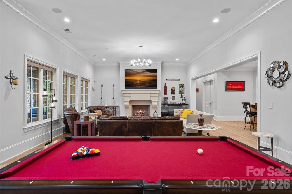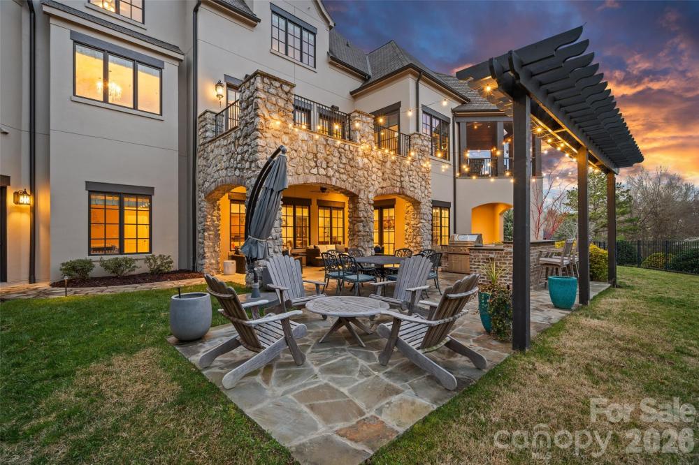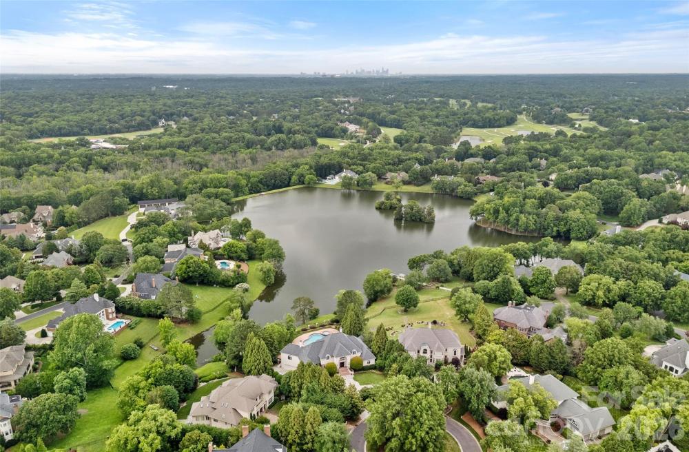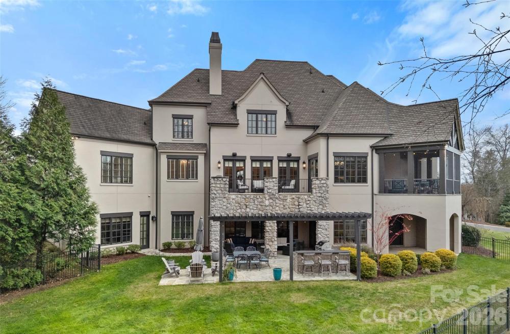 Situated on a grand corner lot in the exclusive gated community of Challis Farm, this sophisticated estate offers refined living and exceptional entertaining just minutes from SouthPark. A private golf cart path provides direct access to Carmel Country Club, while residents also enjoy private lake access and a community dock. Inside, beautifully refinished walnut floors, soaring ceilings, and elegant architectural details create a timeless and inviting atmosphere. Expansive windows throughout the home provide panoramic interior views overlooking the outdoor living spaces, creating a seamless connection between indoor and outdoor entertaining. The showstopping chef’s kitchen features a double island, quartzite countertops, custom hood, 8-burner Wolf range, Sub-Zero refrigerator, sizable scullery, and a sunny breakfast area overlooking the veranda. A screened porch off the kitchen offers a peaceful setting for morning coffee. The main level also includes a private executive office, living room with built-ins and a gas fireplace with a striking limestone mantel, a sophisticated formal dining room, and a custom wine bar. The primary suite on the main level features vaulted ceilings with exposed wood beams, custom his and hers closets, and a spa-style bath with a tiled walk-in shower, soaking tub, and individual vanities. Upstairs are three bedrooms, each with its own en-suite bath, along with a spacious bonus room and versatile loft space perfect for studying or reading a book. The fully finished basement is designed for elevated entertaining and extended living, featuring a custom 450-bottle wine room, billiard area, full living room with gas fireplace, second kitchen, flex room or gym, bedroom and full bath, as well as a golf cart garage. This level opens directly to the covered patio and outdoor kitchen, creating an ideal flow for hosting and outdoor gatherings while also offering tremendous storage throughout. This is a rare opportunity for elegant estate living in one of South Charlotte’s most sought-after gated communities.