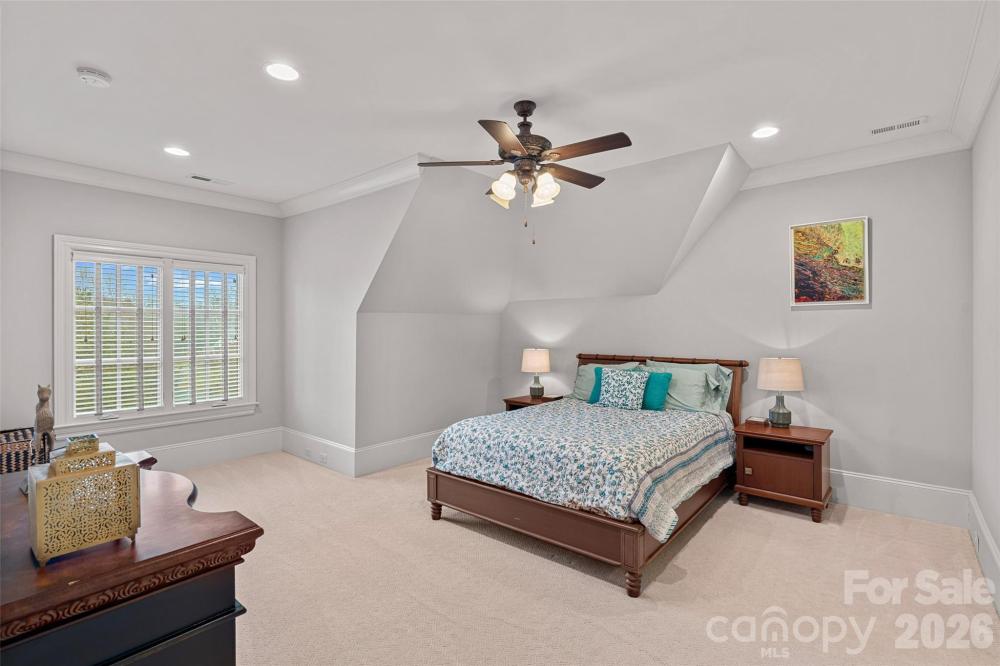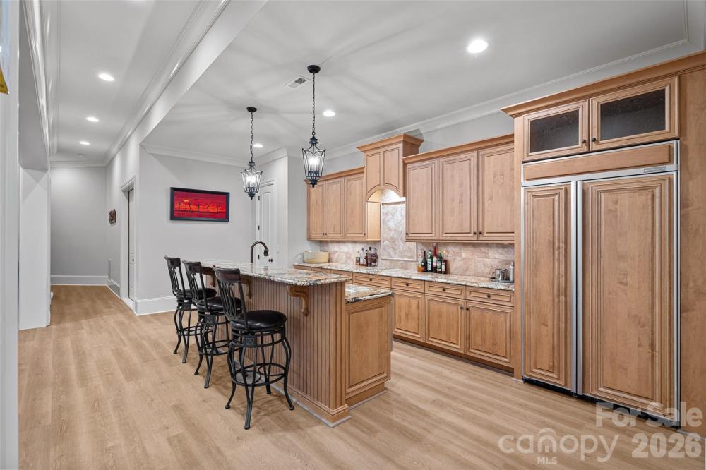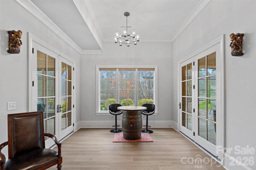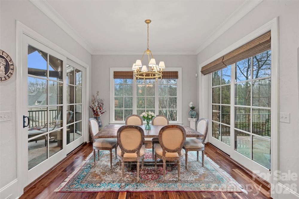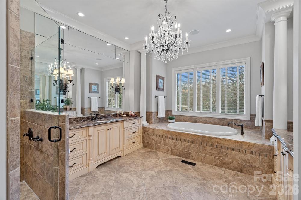 Situated on a grand corner lot in the exclusive gated community of Challis Farm, this sophisticated estate offers refined living and exceptional entertaining just minutes from SouthPark. A private golf cart path provides direct access to Carmel Country Club, while residents also enjoy private lake access and a community dock. Inside, beautifully refinished walnut floors, soaring ceilings, and elegant architectural details create a timeless and inviting atmosphere. Expansive windows throughout the home provide panoramic interior views overlooking the outdoor living spaces, creating a seamless connection between indoor and outdoor entertaining. The showstopping chef’s kitchen features a double island, quartzite countertops, custom hood, 8-burner Wolf range, Sub-Zero refrigerator, sizable scullery, and a sunny breakfast area overlooking the veranda. A screened porch off the kitchen offers a peaceful setting for morning coffee. The main level also includes a private executive office, living room with built-ins and a gas fireplace with a striking limestone mantel, a sophisticated formal dining room, and a custom wine bar. The primary suite on the main level features vaulted ceilings with exposed wood beams, custom his and hers closets, and a spa-style bath with a tiled walk-in shower, soaking tub, and individual vanities. Upstairs are three bedrooms, each with its own en-suite bath, along with a spacious bonus room and versatile loft space perfect for studying or reading a book. The fully finished basement is designed for elevated entertaining and extended living, featuring a custom 450-bottle wine room, billiard area, full living room with gas fireplace, second kitchen, flex room or gym, bedroom and full bath, as well as a golf cart garage. This level opens directly to the covered patio and outdoor kitchen, creating an ideal flow for hosting and outdoor gatherings while also offering tremendous storage throughout. This is a rare opportunity for elegant estate living in one of South Charlotte’s most sought-after gated communities.