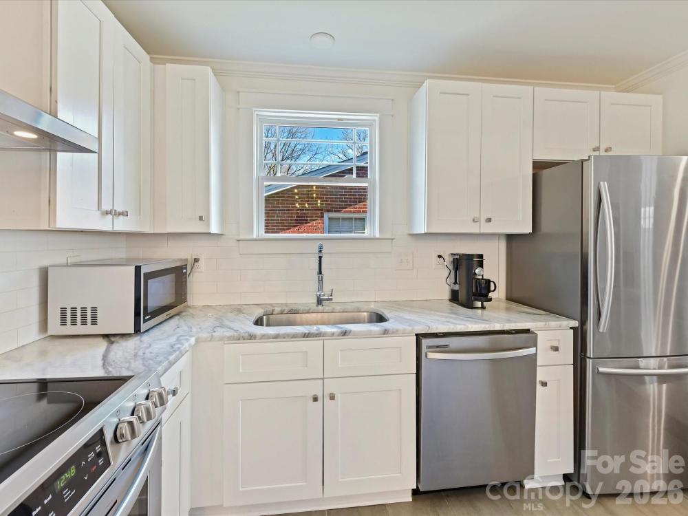 Fully updated, full-brick two-bedroom, two-bathroom home conveniently located near NoDa, Uptown, and Plaza Midwood. Move-in ready, offering an open and functional floor plan with hardwood floors throughout & crown molding in the main living areas. Gorgeous kitchen and dining area with shaker style cabinets, marble countertops, stainless steel appliances, subway tile backsplash and an island with at-counter seating. Rare for the area, the primary bedroom features a private en-suite bathroom with a tiled walk-in shower, while a second full hallway bathroom includes a tiled tub/shower combination. Separate laundry room/mud room leads to the back door & back patio to the fully fenced, tree-lined backyard. Tankless water heater 2023, HVAC, windows & roof 2020. Transferrable termite bond. Enjoy the character of a 1960's home with the updates for modern living!