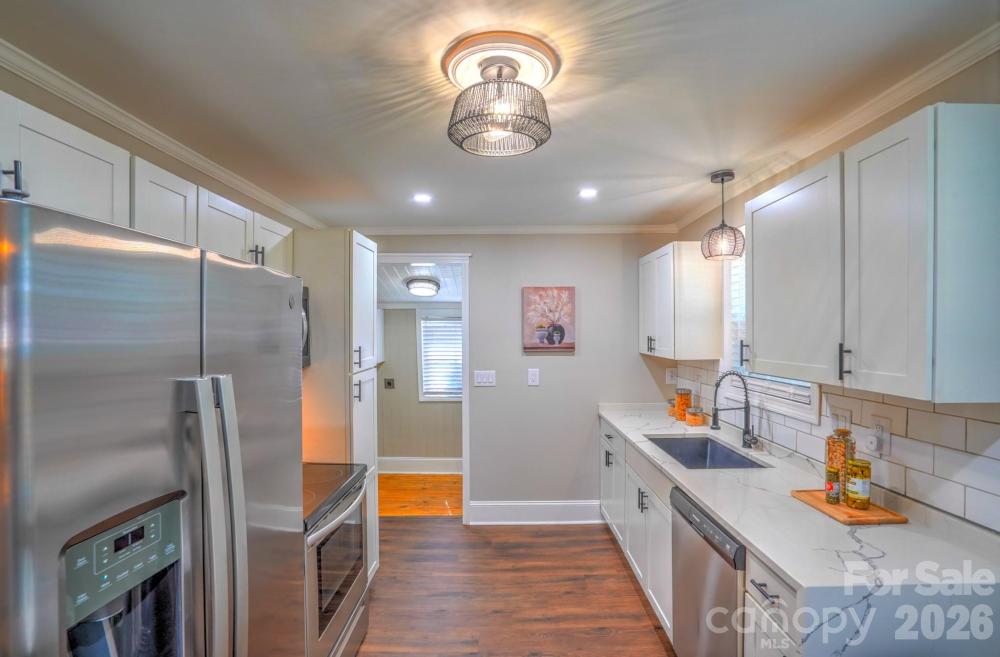 Welcome to this charming bungalow perfectly located just minutes from the energy of Uptown Charlotte, NC and the vibrant dining, breweries, and nightlife of South End. Nestled near the historic neighborhoods of Enderly Park and Wesley Heights, this home offers charm, comfort, and convenience in one of Charlotte’s growing areas. Inside, you'll find beautiful original hardwood floors, a bright open layout, and lighting and hardware that create a warm, welcoming atmosphere. The kitchen features modern cabinetry, quartz countertops, a stylish subway tile backsplash, and newer stainless appliances, making it both functional and attractive for everyday cooking or entertaining. The cozy living room with a brick and tile surround fireplace adds character and a perfect space to unwind. Two spacious bedrooms with custom built-ins provide great storage, while the bathroom includes a vanity and enclosed shower with clean, practical finishes. A mudroom with washer and dryer connections adds convenience and additional utility space. Step outside onto the new rear deck overlooking a shaded, fully fenced backyard, ideal for relaxing evenings, pets, or entertaining friends. Additional highlights include a large attic for extra storage, a low-maintenance yard, and a quiet, friendly neighborhood setting—all just a short drive from Charlotte’s main employment and entertainment districts. This charming bungalow offers classic character, comfortable living, and a prime location close to the heart of the city.