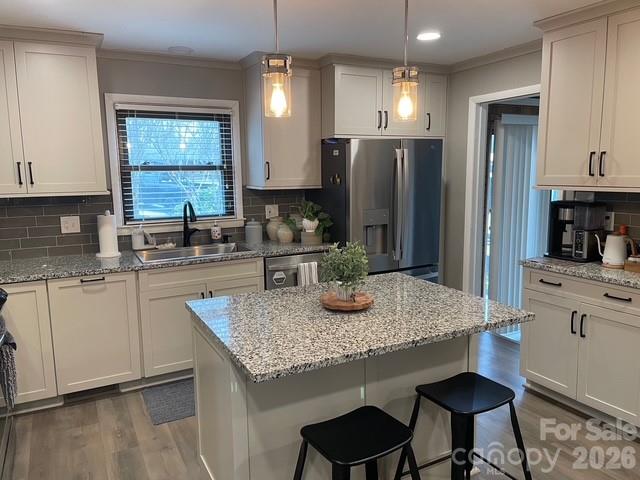 Looking for a ranch home in an established neighborhood with a half acre lot? Stop the car! Full Brick....Complete Kitchen remodel w/ custom Cabinets, granite, Bar stool Island, & subway tile backsplash. Brand New Fridge Included! LVP thru-out most of home & Freshly Painted! Additional features incl soft close drawers & Cab, built-in shelves / desk, board & batten wall accents, upgraded bathrooms, stove fireplace insert, whole house attic fan, crown molding, & more. The Sun/Bonus Room add-on gives you lots of fun family gathering space.....great for a Rec room. The air compressor, tools, and two freezers in the back section of garage stay with the house! Attic has tons of flooring for storage. Outside, you'll find a sturdy 10 x 12 powered workshop shed, a fenced yard, 3 fig trees, & garden beds. Convenient West Charlotte location......minutes from I-485, 7 min to the airport, & about 20 min to Uptown. No HOA! Seller offering 5K in closing cost credit! More pics to follow