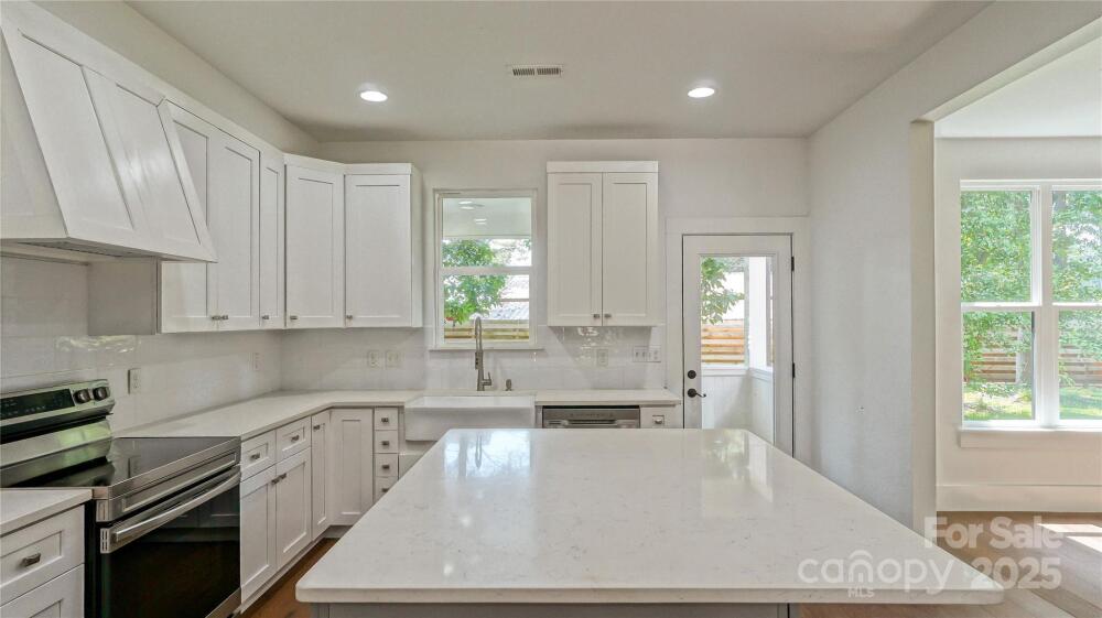 Discover modern comfort in this impressive Charlotte residence offering a beautifully designed living space. With 3 bedrooms/2.5 baths and multiple flexible living areas—including a home office & a bonus room—this home blends functionality with contemporary style. Sunlight pours through windows, illuminating crisp white walls & warm engineered wood floors. The kitchen is a chef’s dream, featuring sleek white cabinetry, a farmhouse sink, a large island with a breakfast bar, Quartz countertops & SS appliances. Bathrooms are elegantly finished with dual vanities, modern fixtures & a spa-like primary bath with ceramic tile & a glass-enclosed shower. A standout bonus room with sloped ceilings and a designer light fixture adds a versatile space for entertainment or creativity. Retreat to the private, fenced-in backyard with a covered porch ideal for shaded evening relaxation. Conveniently located near I-77 for an easy commute to Uptown, this home is the perfect blend of style & livability.