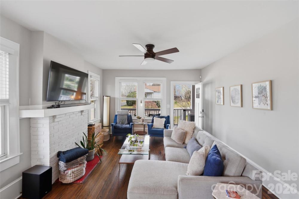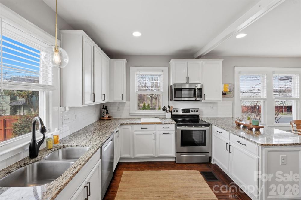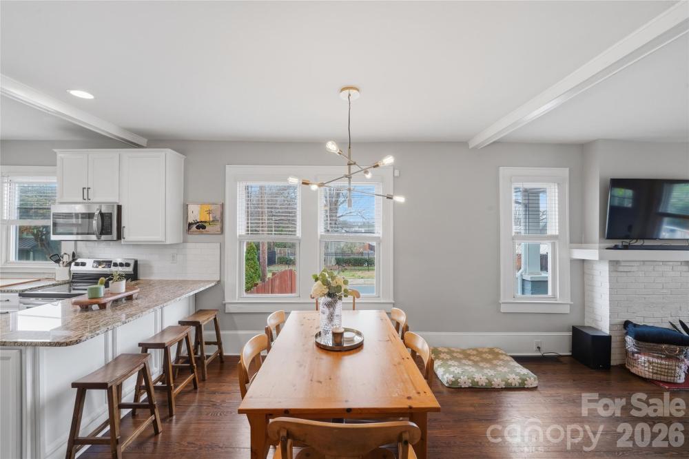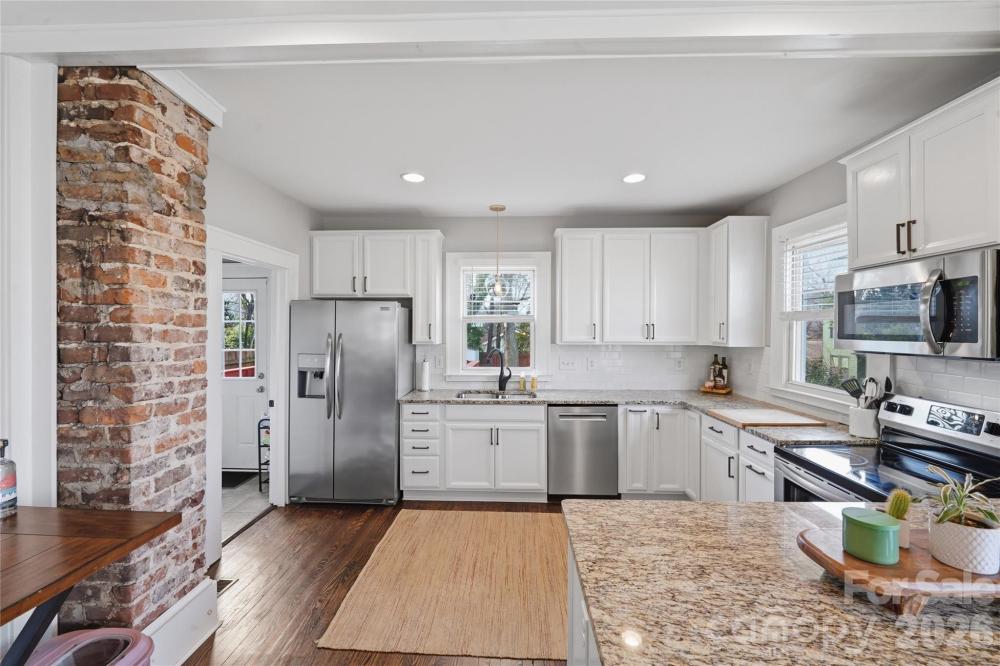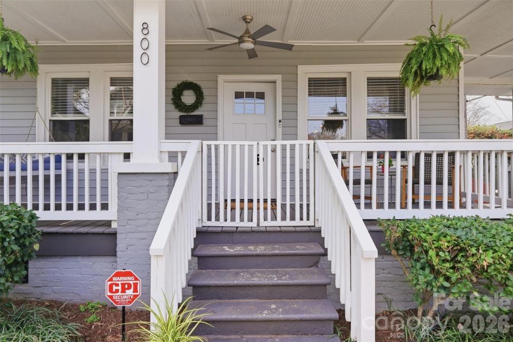 Welcome to this beautifully maintained corner-lot home tucked on a quiet, local-traffic street in Charlotte. This residence offers multiple inviting living spaces, including a spacious living room with a decorative brick wall, a formal dining area, and a rear deck overlooking a private, fenced backyard, perfect for relaxing or entertaining. Start your mornings swinging on the large front porch, complete with a beadboard ceiling and bench swing. The bright, open kitchen features white cabinets, a subway tile backsplash, granite countertops, and stainless steel appliances, including a 2024 Bosch dishwasher and a 2023 disposal. Thoughtful touches like pull-out vented cabinet drawers add both style and function. Hardwood floors run throughout the home, with ceramic tile in baths and laundry, and plush carpet in the front bedroom. The laundry room provides ample storage, while a 6’ privacy fence ensures your backyard is a serene retreat. Additional features include 2” blinds, a keypad Yale front door, and stunning views of Uptown Charlotte. Enjoy the convenience of being walkable to the light rail and participating in community events like chili cookouts, holiday parties, and other neighborhood gatherings. This home combines comfort, style, and a fantastic location—ideal for those seeking the perfect balance of city living and peaceful privacy.