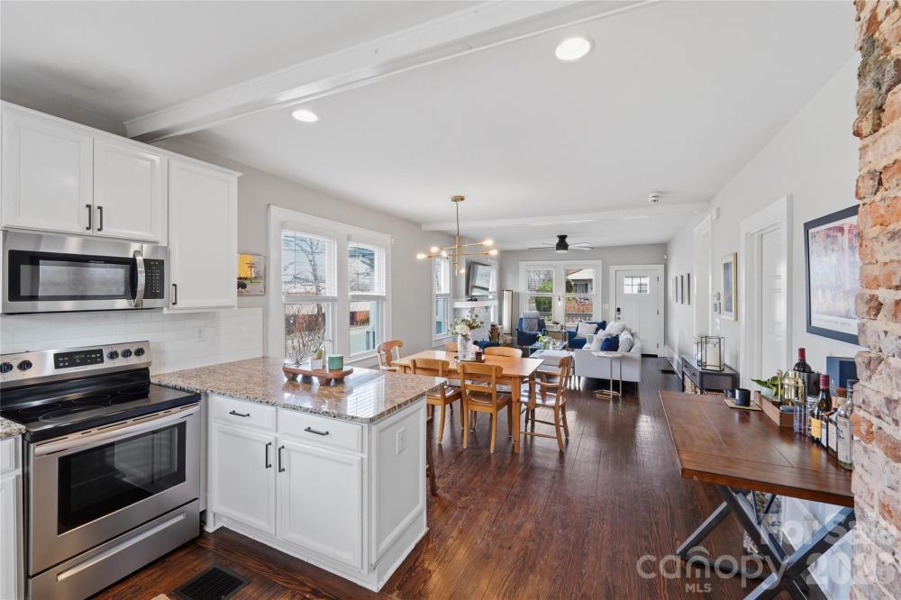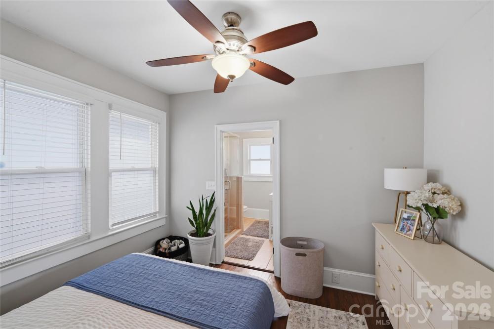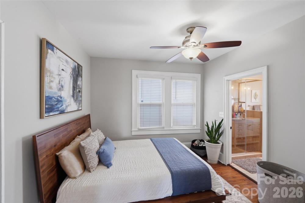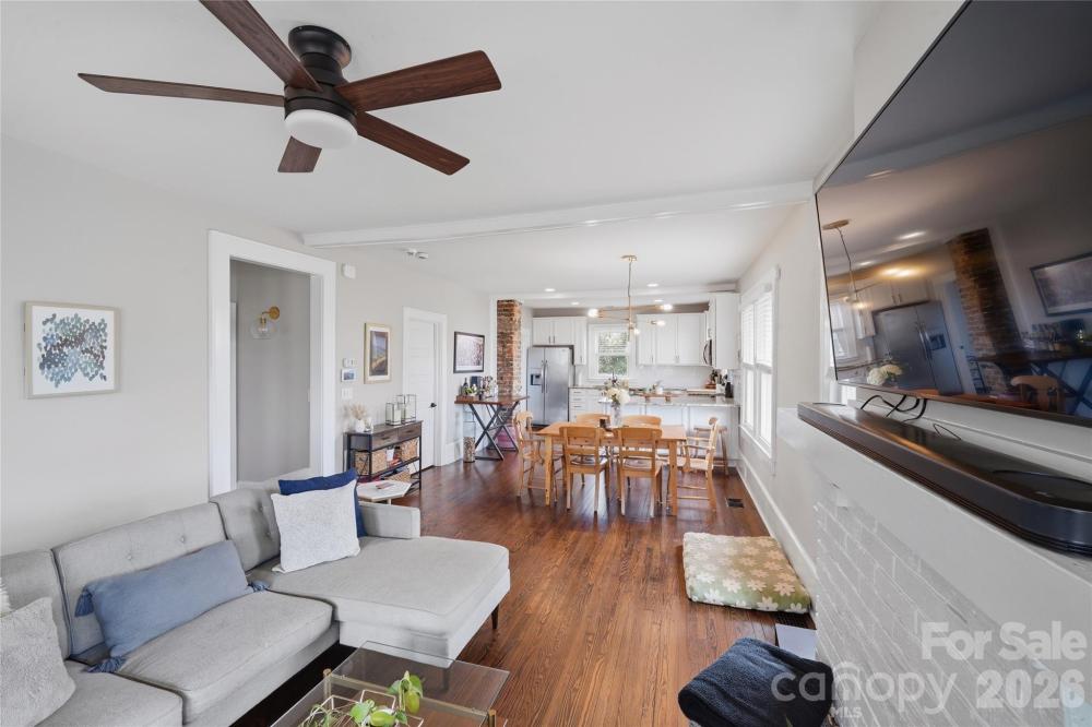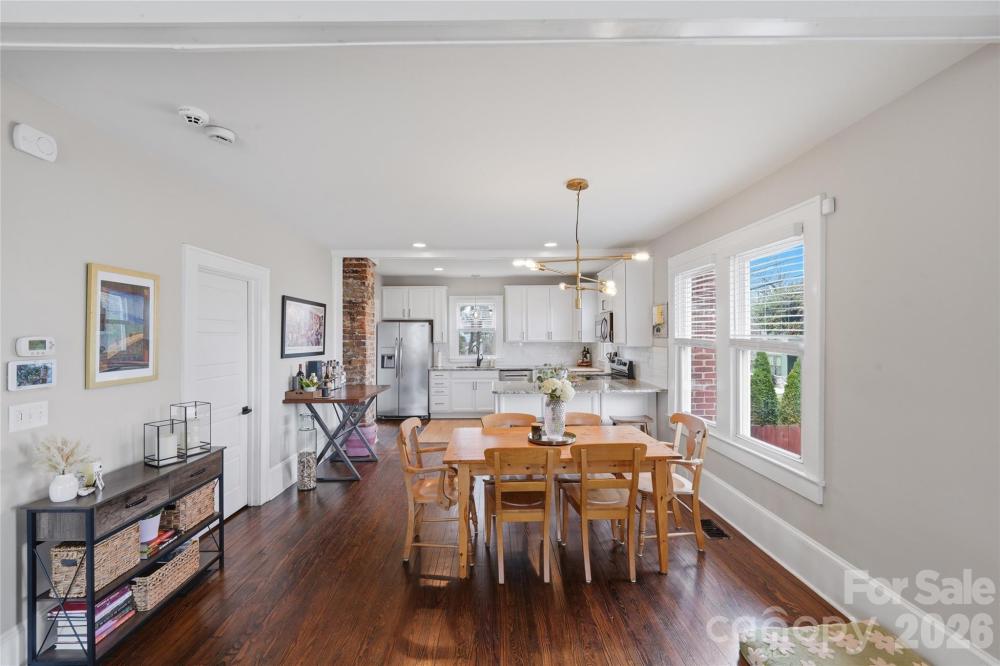 Welcome to this beautifully maintained corner-lot home tucked on a quiet, local-traffic street in Charlotte. This residence offers multiple inviting living spaces, including a spacious living room with a decorative brick wall, a formal dining area, and a rear deck overlooking a private, fenced backyard, perfect for relaxing or entertaining. Start your mornings swinging on the large front porch, complete with a beadboard ceiling and bench swing. The bright, open kitchen features white cabinets, a subway tile backsplash, granite countertops, and stainless steel appliances, including a 2024 Bosch dishwasher and a 2023 disposal. Thoughtful touches like pull-out vented cabinet drawers add both style and function. Hardwood floors run throughout the home, with ceramic tile in baths and laundry, and plush carpet in the front bedroom. The laundry room provides ample storage, while a 6’ privacy fence ensures your backyard is a serene retreat. Additional features include 2” blinds, a keypad Yale front door, and stunning views of Uptown Charlotte. Enjoy the convenience of being walkable to the light rail and participating in community events like chili cookouts, holiday parties, and other neighborhood gatherings. This home combines comfort, style, and a fantastic location—ideal for those seeking the perfect balance of city living and peaceful privacy.