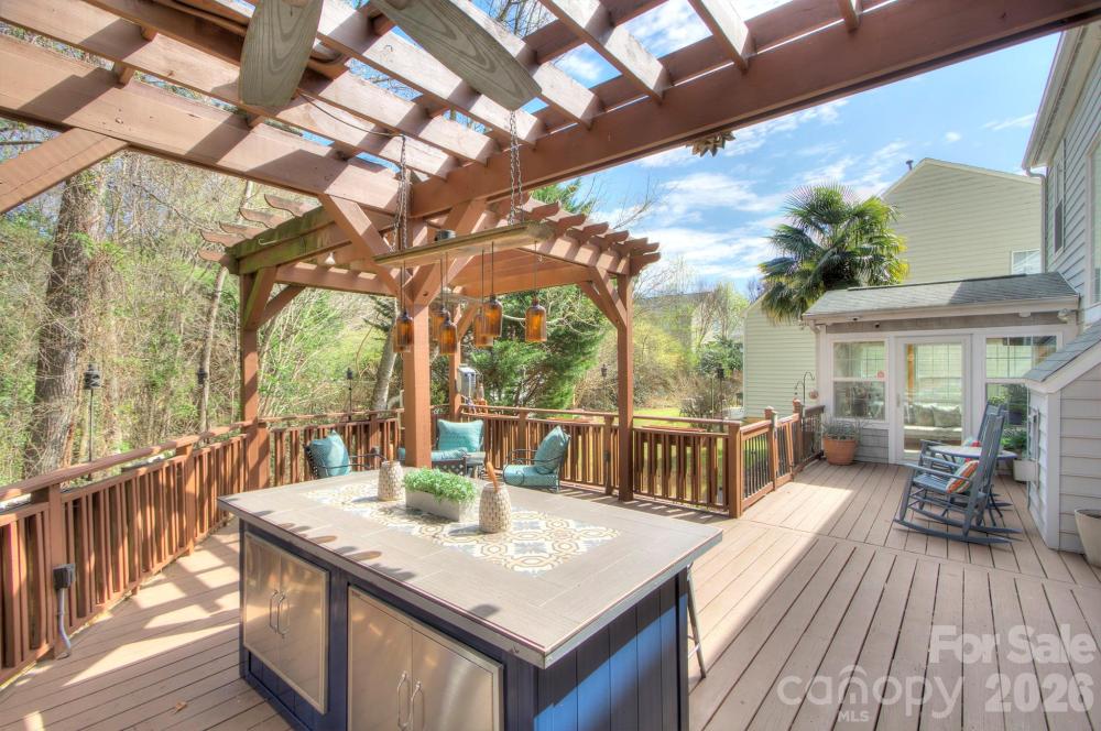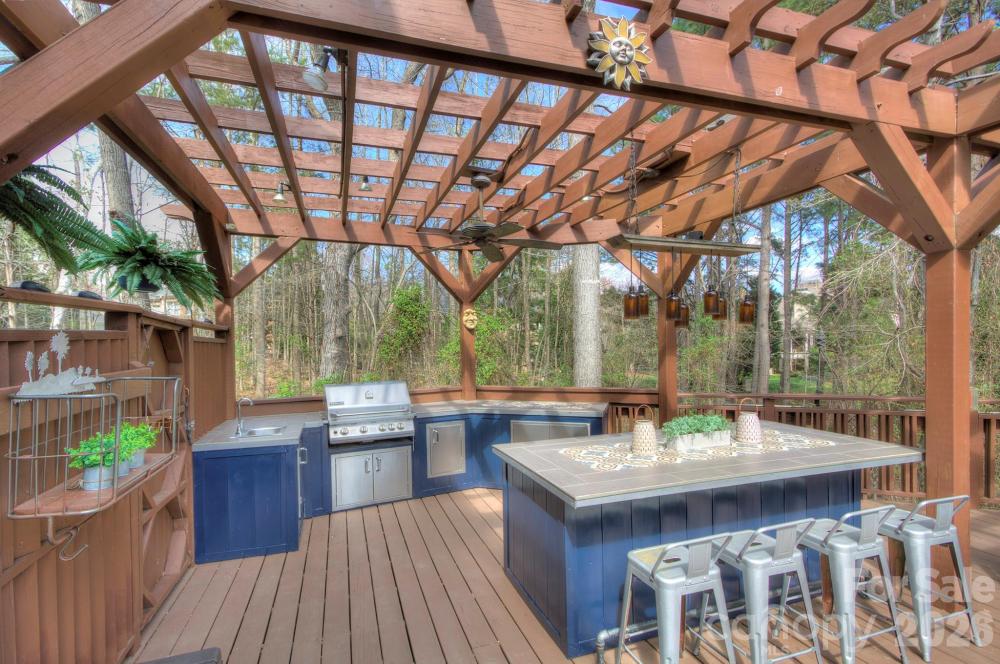 Welcome to this beautifully updated home where outdoor living becomes a natural extension of everyday life. The expansive 600 sq ft deck creates the perfect setting for entertaining or relaxing evenings at home, complete with an outdoor kitchen, dedicated entertaining space, and pergola. Natural gas direct line JennAir grill and hand sink. The lot offers exceptional privacy with mature trees and adjacent HOA green space, creating a peaceful backdrop rarely found in such a convenient location. Inside, the updated kitchen features abundant cabinet and counter space—truly a chef’s delight and ideal for both everyday cooking and hosting gatherings. Majority of windows replaced. Sliding door replaced. The spacious primary suite offers a private retreat with an en-suite bathroom featuring dual vanities, a soaking tub, and separate shower. The walk-in closet with custom organizer provides excellent storage and functionality. With fresh paint in many areas and brand-new carpet, this home is truly move-in ready and waiting for its next owners to begin making memories. Located in sought-after Edinburgh, the home is just minutes from Ballantyne, I-485, and Indian Land. Enjoy a quick ride to The Bowl at Ballantyne for dinner, drinks, or live entertainment.