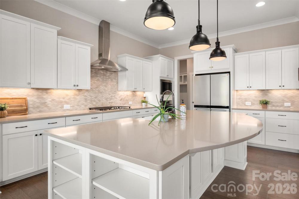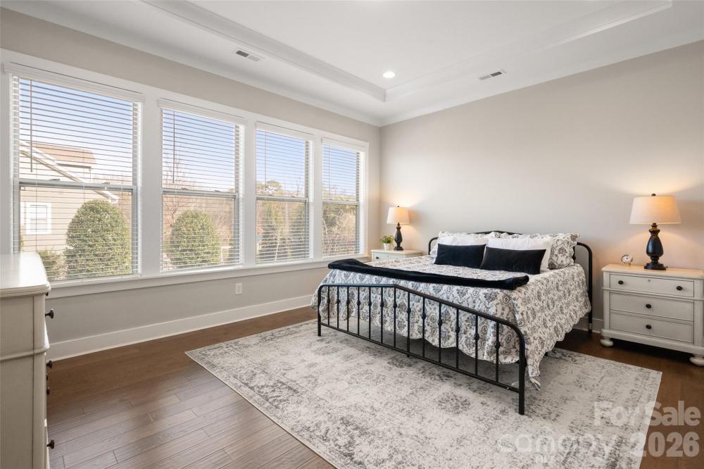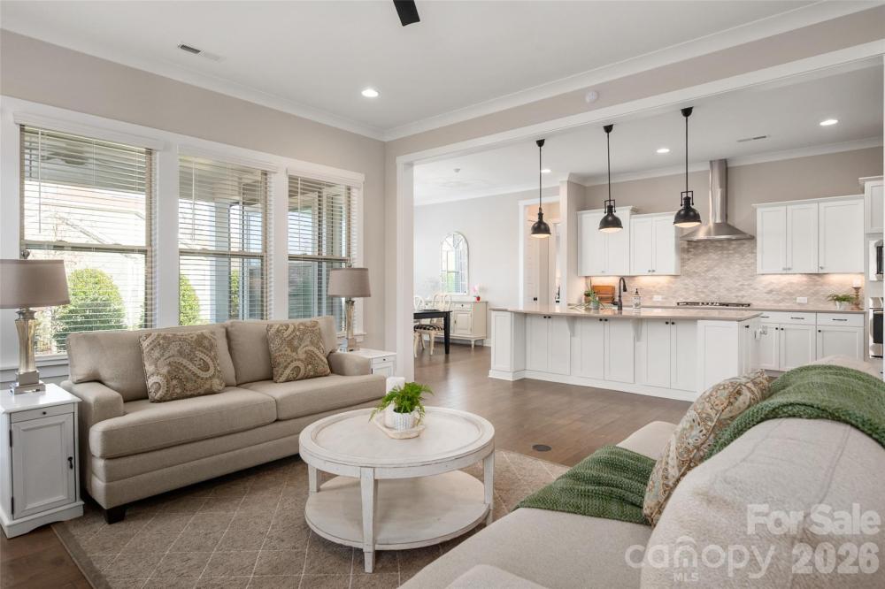 to this stunning 5-bedroom, 3.5-bath home located in the amenity-rich Chapel Cove community aoffering over 3,400 square feet of thoughtfully designed living space. Engineered hardwoods flow throughout the main level, creating a comfortable and welcoming atmosphere, while 9-foot ceilings and 8-foot doors enhance the home’s refined feel. A white chef’s kitchen features a gas cooktop, wall oven, and an oversized island, and flows seamlessly into the dining area and family room—ideal for entertaining. With an abundance of natural light this homes feels light and airey. The family room includes crown molding and the warmth of the fireplace. This floorplan showcases the sought after main level primary suite with a large garden tub and shower with a bench. Two custom walk-in closets provides room for everyones clothes. Additional details include a main level home office w/french doors and a mud room outfitted with a drop zone. Upstairs, you will find a large bonus room (or 5th BR) and 3 secondary bedrooms (two sharing a Jack-and-Jill bath and the 3rd with a private bath) making space for everyone. Enjoy seamless Indoor/Outdoor with an oversized covered patio with a stone fireplace and a spacious fenced in yard overlooking the treed rear yard.