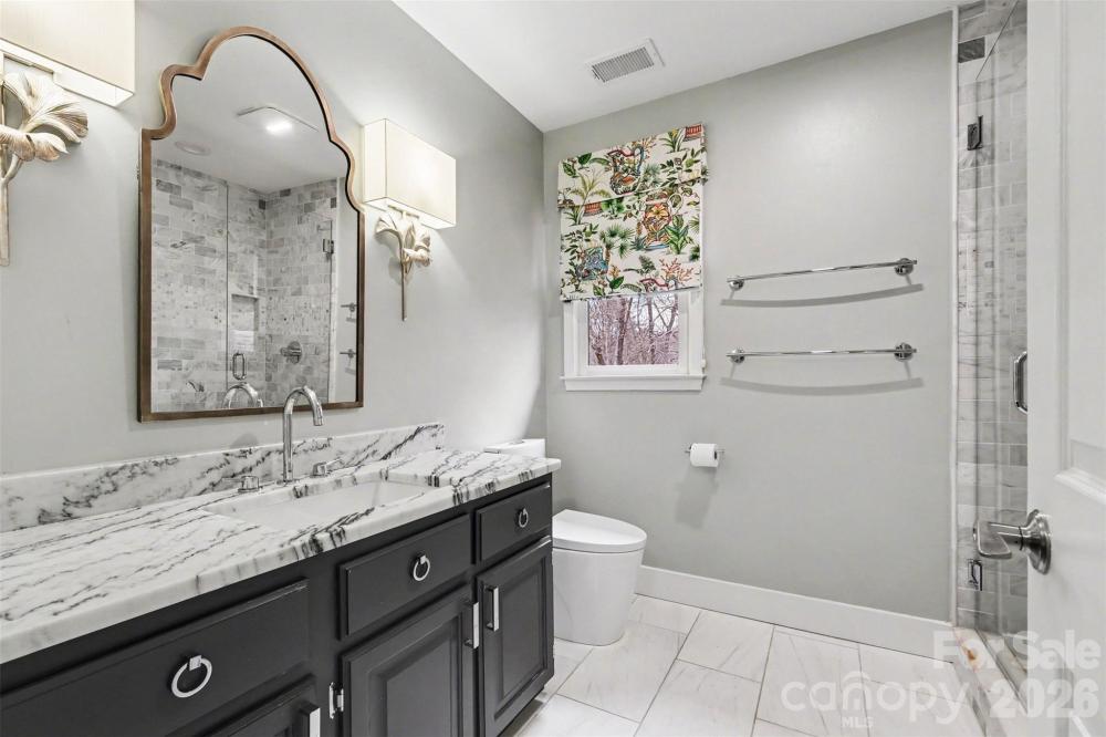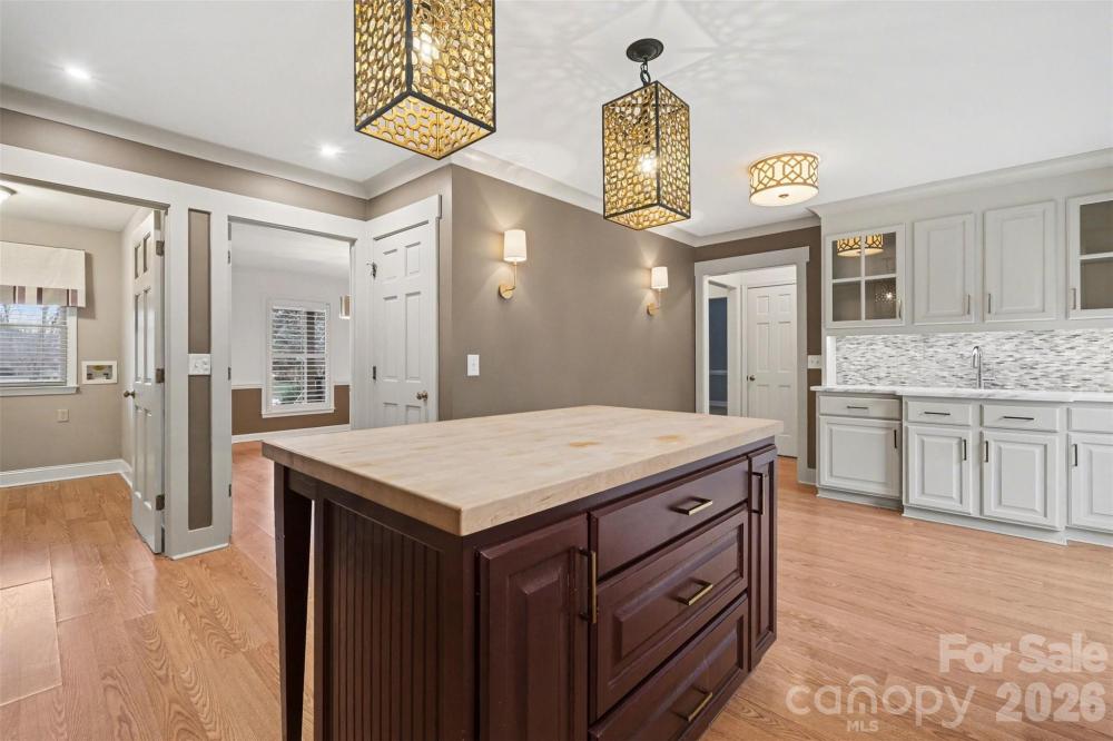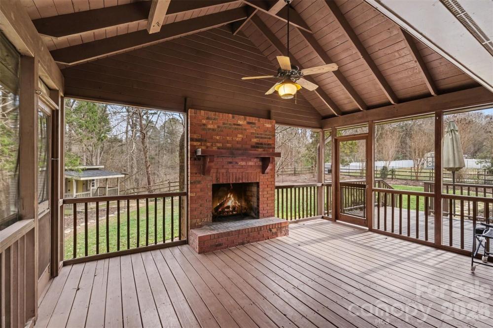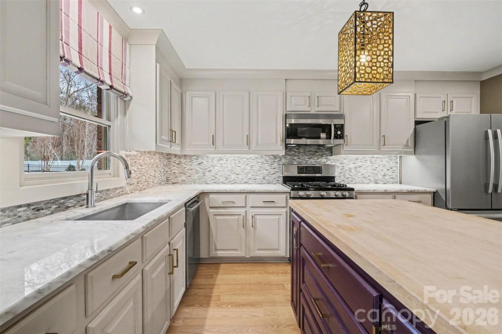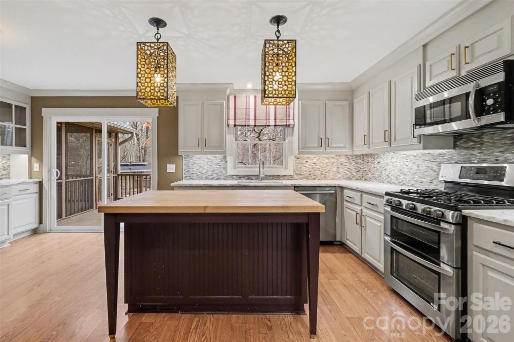 Welcome to your dream home, where modern elegance meets cozy charm! This ASID designer updated residence is a true gem, boasting an array of stunning features that blend functionality with style, including Farrow and Ball paint inside and out. As you step inside, you're greeted by a fabulous living room showcasing a cathedral ceiling adorned with rustic wood beams. Built-in shelving complements the space, while a natural gas fireplace adds warmth and character, making it the perfect spot for gatherings or quiet evenings at home. The heart of this home is undoubtedly the spectacular kitchen. Here, culinary enthusiasts will appreciate the stainless-steel double oven gas range, and custom breakfast bar with convenient prep sink. Gorgeous marble countertops provide both beauty and durability, while designer pendant lights illuminate the area beautifully. The centerpiece is a spacious butcher block island, ideal for meal prep or casual dining. Retreat to the amazing primary bedroom suite. The ensuite bathroom is a true oasis where luxury continues with marble floors, British bath fixtures, designer wallpaper including Schumacher grass cloth walls and Manuel Canovas patterned powder room, featuring a custom walk-in shower complete with a soaking tub and elegant glass shower doors—perfect for unwinding after a long day. Step from the living room through French doors to discover a wonderful, screened porch, equipped with a cozy wood-burning fireplace, perfect for relaxing evenings under the stars. Adjacent to this porch is a spacious deck that overlooks your private backyard, enclosed with a charming split rail fence with David Austin roses and mature perennial beds that would make a master gardener proud. The yard also features a delightful custom built shed, complete with swings—ideal for both play and storage and the garage boasts new epoxy floors. Located conveniently close to shopping, dining, hospitals, and the interstate, this home offers easy access to everything you need, all while enjoying the freedom of no HOA. Don’t miss this opportunity to own a beautifully crafted home that truly has it all!