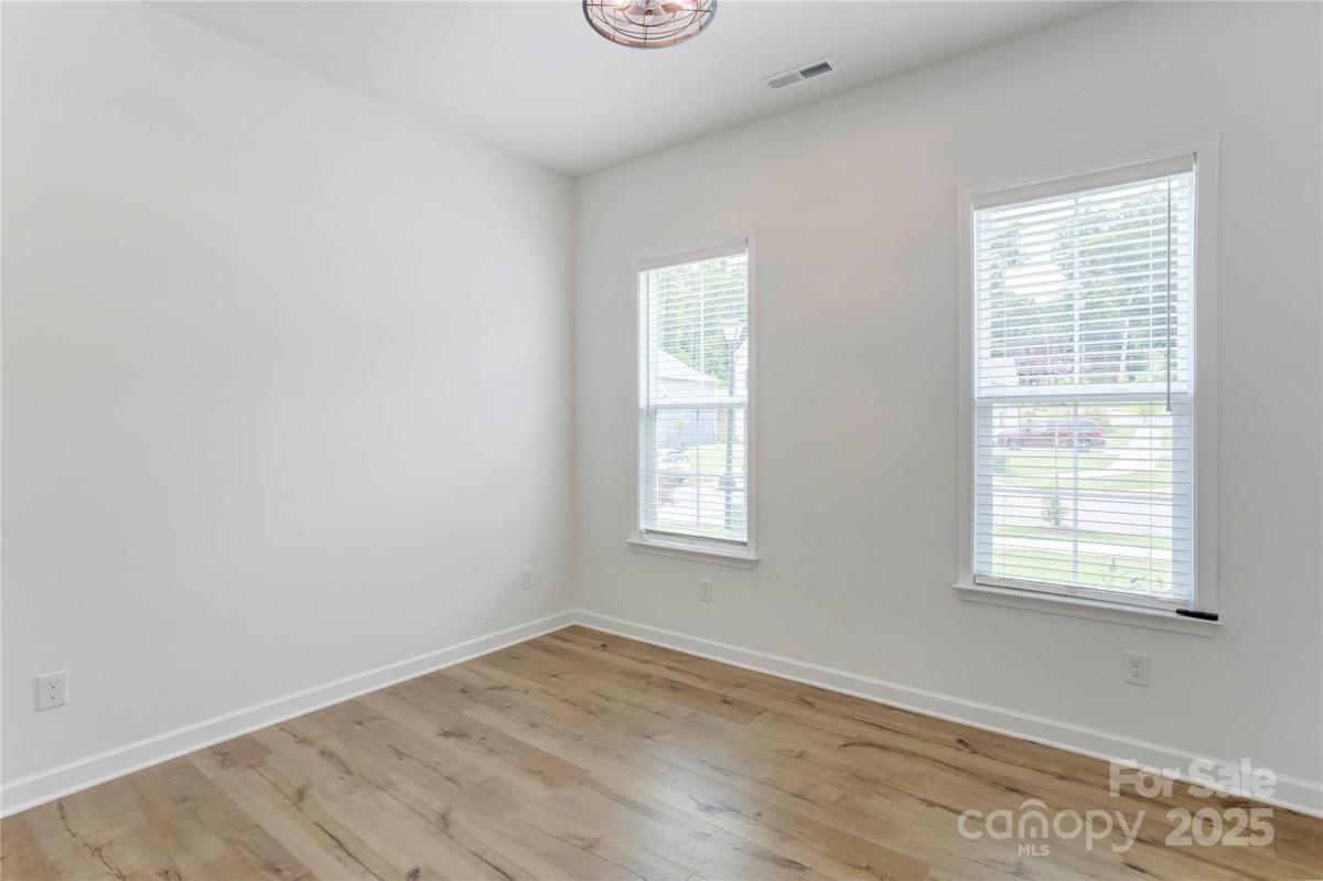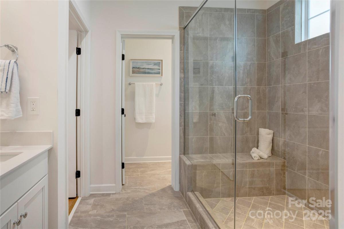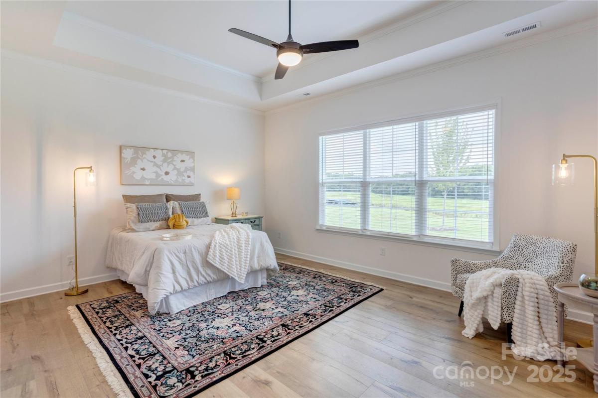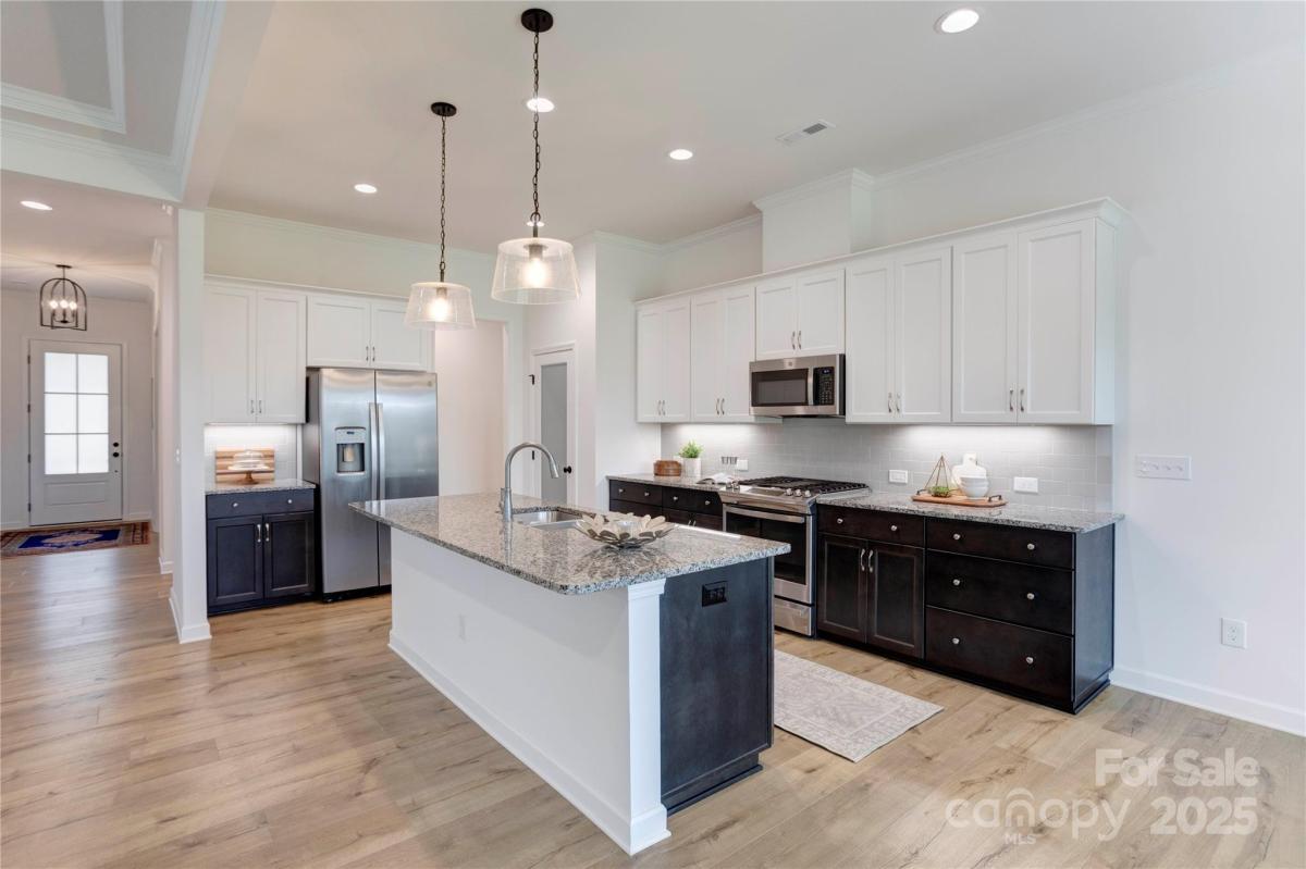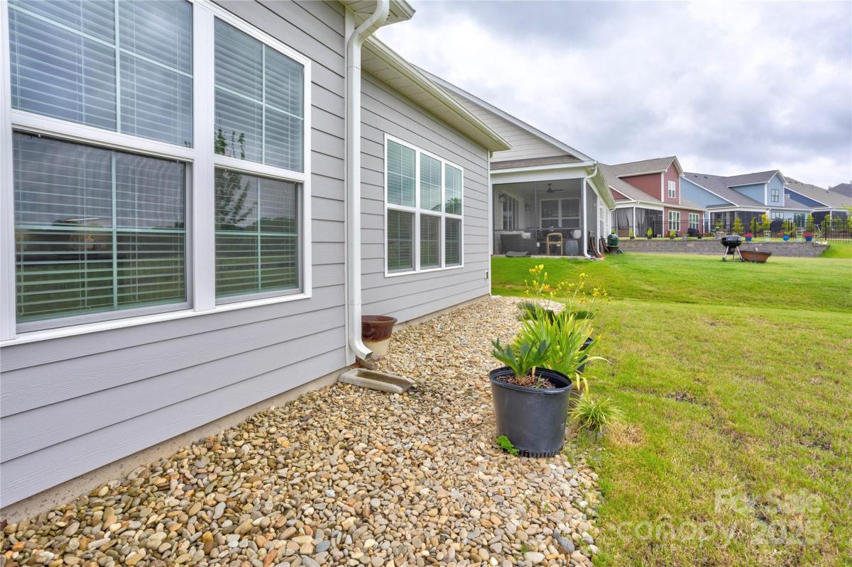 Welcome to this premier homesite in Red Hill—a charming Niblock community rich in history. Backing to the scenic Carolina Thread Trail, this 2023-built ranch, the Avalon, is better than new and filled with thoughtful upgrades. Step inside to find 10-foot ceilings, oversized windows, and a bright, open-concept layout that seamlessly blends comfort and style. This 3-bedroom 2 bath, split-bedroom floor plan offers privacy and functionality, including a spacious primary suite with a tiled walk-in shower, and dual vanities. Enjoy peaceful mornings on your screened-in patio overlooking a picturesque stone bridge lighted in the evenings. Additional highlights include coffered and tray ceilings, luxury vinyl plank flooring, granite countertops, stainless steel appliances, and a large kitchen island perfect for entertaining. Primary closet connects to laundry room. A versatile flex space makes an ideal home office or hobby room.