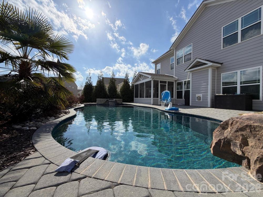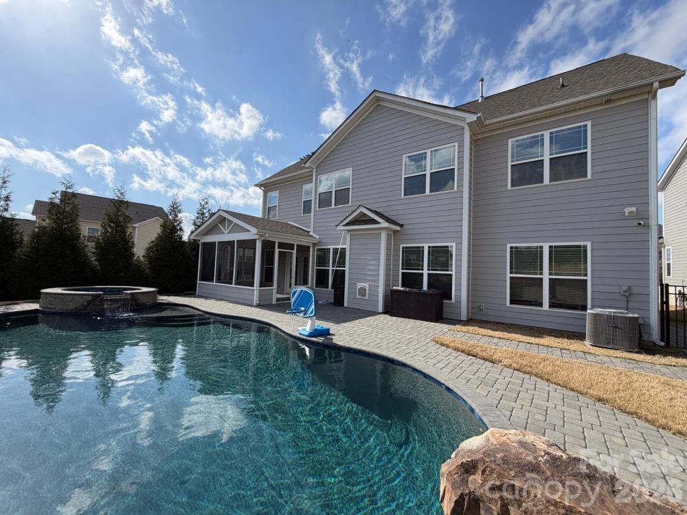 This incredible home has it all! Featuring 5 bedrooms, 4 full baths, and a 3-car garage, this beautifully upgraded home offers over 4,000 sq ft of elegant living space and an amazing backyard retreat. The gourmet kitchen features exquisite quartz countertops, gas cooktop with vented hood, upgraded modern lighting, and a large walk-in pantry with custom shelving. Elegant 44" board and batten wainscoting enhances the two-story foyer, formal dining room, and loft. The functional floor plan includes a main-level bedroom and full bath, ideal for guests. Upstairs offers a spacious loft, huge bonus room, and an impressive primary suite with dual quartz vanities, soaking tub, separate shower with bench, and a massive walk-in closet with custom shelving. A charming custom pet nook under the stairs adds character and convenience. Enjoy the private outdoor oasis featuring a screened porch and saltwater pool with sun shelf, jumping rock, waterfall feature, and hot tub. A stone paver walkway leads to the fenced backyard, enhanced with privacy tree landscaping and an in-ground basketball goal. The 3-car garage includes epoxy flooring, custom storage racks, and a Tesla wall charger. This home combines luxury upgrades with resort-style outdoor living. Must see!