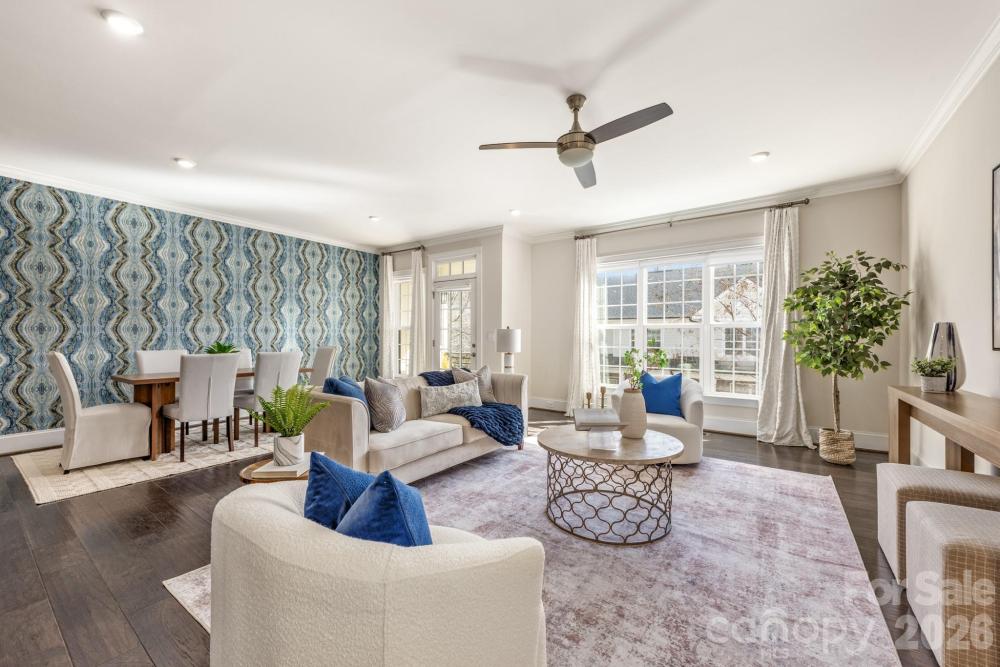 Moments from the charming heart of Davidson, 541 Griffith Village Lane presents a refined three-bedroom townhouse that seamlessly blends architectural elegance with modern comfort. Built in 2019 and spanning 2,840 square feet across three thoughtfully designed levels, this residence offers a sophisticated yet effortless lifestyle in one of the area’s most desirable communities. The walk-out lower level welcomes guests through a private entrance and unfolds into an inviting family lounge anchored by a sleek linear fireplace, creating a warm and contemporary focal point. This versatile level also features a dedicated home office, fitness studio, and an elegant bar complete with wine refrigeration, offering an ideal setting for entertaining or relaxed evenings at home. Above, the main living level—conveniently accessed from both the back patio and the detached two-car garage—reveals a grand open-concept design that effortlessly connects the kitchen, dining, and living spaces. Rich wood flooring, curated finishes, and custom built-ins enhance the refined atmosphere. The chef’s kitchen is appointed with island seating, a gas cooktop, convection oven, beverage and wine refrigeration, and ample cabinetry—perfectly suited for both everyday living and elegant gatherings. The upper level offers a tranquil private retreat. The primary suite features a generous walk-in closet and a beautifully appointed en suite bath, while two additional bedrooms and a full bath provide comfortable accommodations for family or guests. Outdoor spaces add another layer of appeal, with a fenced patio and covered porch offering intimate places to unwind or entertain. A detached two-car garage with additional parking ensures both convenience and privacy. Timeless in design and turnkey in condition, 541 Griffith Village Lane offers a rare opportunity to experience elevated townhouse living just moments from Davidson’s boutiques, dining, and the vibrant energy of the village.