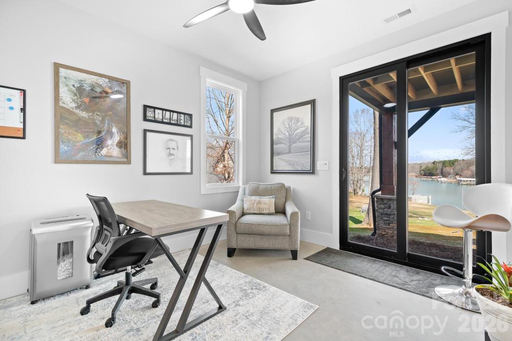 Over 1 acre of Magnificent waterfront unrestricted land (NO HOA) with approx 217' of stabalized shoreline, a 40' covered fixed boatslip and additional floating dock. Build your future home while you live in the 2024 build secondary home with 2 bedrooms a dedicated office or you could use this as a 3rd bedroom and 2 car garage. No expense was spared during the construction. The complete Kitchen Aid appliance package, Additional holiday dishes can be stored in the hidden cabinets in front of the bar stools, Tankless propane water heater, Sono's sound system indoor and out, complete wifi home and wifi at the dock, Lake fed irrigaion pump installed, Power at the dock for a future lift, Smart home wiring, Generator transfer switch installed, 30amp Electric car charger in the garage and so much more. You never have to worry if you have enought dock space for your friends and family. Enjoy every night sitting on your covered porch or on the covered dock with a seating area. Fall firepit nights with the peace and tranquility you have been searching for. Bring your own builder or have a chat with the builder that constructed this wonderful open floor plan contemporary home. Did we mention there is a former block boathouse that could be converted into a Jimmy Buffet style waterfront retreat. Long range waterfront views from the primary bedroom, great room, kitchen and home office. You can enjoy Lake Norman year round with deep water even when Duke energy brings the lake down during the winter months. You can realize what you have vizualized in your new construction home or just enjoy the current home and the lay of the level land. We've included a sample rendering of the primary home which was going to be constructed with the garage and front door on the street side with a wall of sliding glass doors for the bunk room, bathroom and hall. Basically flipping the garage level from back to front. To access the home office or could be used as a 3rd bedroom, enter throught the garage. Magnificent Waterfront views from the sliding glass door.