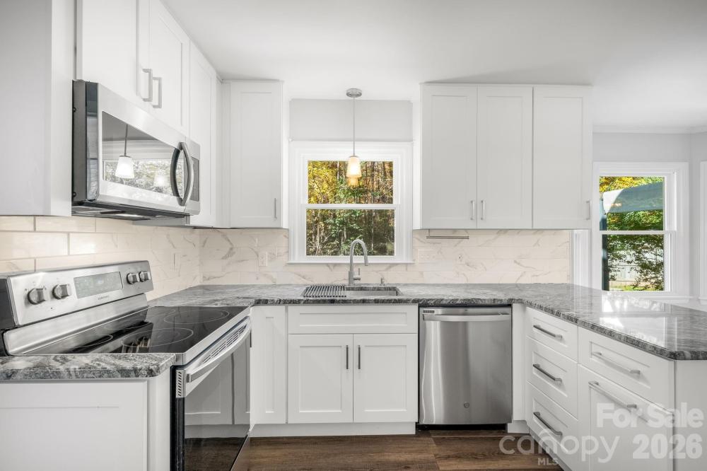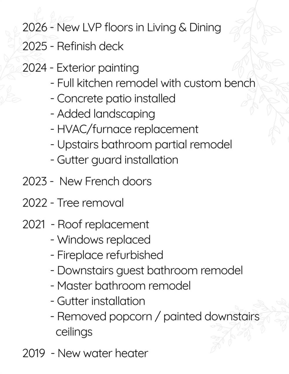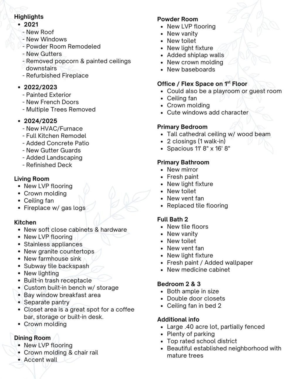 Welcome to beautiful 102 Schuyler Drive, loaded in upgrades and situated on a large .40 acre lot surrounded by mature trees in the popular Shepherds Vineyard neighborhood of Huntersville! Imagine entertaining in your brand new kitchen complete with new soft close cabinets, gorgeous new granite ctrs, new stainless appliances, new LVP floors, new farmhouse sink and breakfast area w/ new custom built-in bench. And that is just the beginning, the sellers have completed the following upgrades all within the last 5 years: full KITCHEN remodel, new APPLIANCES, new HVAC, new WINDOWS, new LVP in Living & Dining rooms, new ROOF, updated baths, exterior PAINTED, refinished DECK, added PATIO, new FRENCH DOORS, New Toilets and more! At the end of the day, relax in the large living room w/ cozy fireplace w/ gas logs. The main floor also features a separate dining room w/ hardwood floors, adorable updated powder room, home office/flex room, laundry closet & storage closet, while french doors lead you to the deck with pergola & patio overlooking the large backyard. Make your way upstairs to the oversized primary suite w/ tall cathedral ceiling, 2 closets & private full bath with beautiful tile floors, dual vanity & oversized garden tub. The secondary bedrooms are spacious in size w/ ample closet space and share the updated hall bath boasting new lighting, new vanity & new tile floors. Additionally they added landscaping, new gutters & gutter guards, removed trees, refurbished the fireplace and removed the popcorn & painted the downstairs ceilings. This home is located on a cul-de-sac street near downtown Huntersville with parks, dining, shopping, breweries, greenways, athletic facilities, tons of recreation and close to I-77, I-485 and in a sought after school district. Some great places include the Huntersville Fitness & Aquatic Center, Lake Norman & boat rentals, numerous golf courses, Huntersville Rec Center, Discovery Place Kids, Latta Nature Preserve, Rural Hill Farm, Birkdale Shopping Village and lots of hiking, walking & biking options plus tons of sport options for all ages with soccer, baseball, pickleball and more!