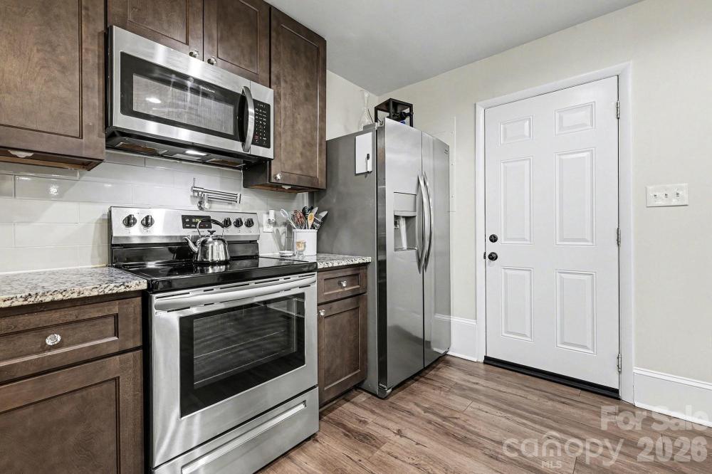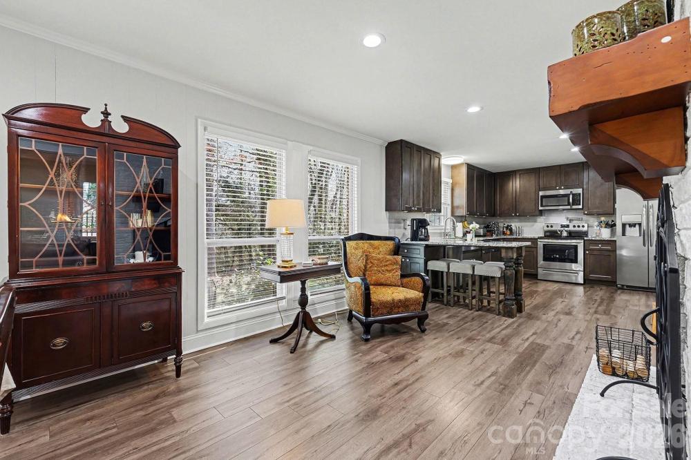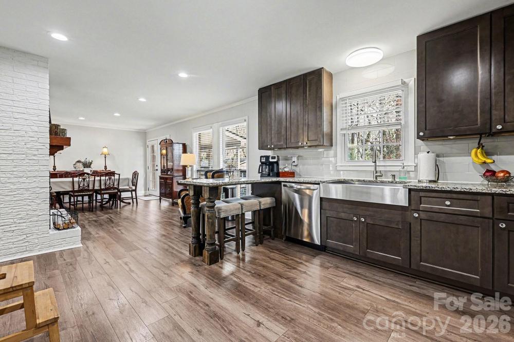 This solid brick ranch offers timeless construction with stylish modern, bright, and open interior. Set on a serene wooded half acre lot, offering privacy and space right in the heart of Kannapolis! Stunning open floor plan with fresh paint throughout. The kitchen features 42” cabinetry, granite countertops, a granite eat in bar, stainless farm style sink, pot filler, and stainless appliances including refrigerator, dishwasher, range, and microwave. Modern lighting with dimmable LED fixtures. Bathrooms showcase artisan tile work. The primary bathroom features glass mosaic tile and a rain style shower. Handsome LVP flooring runs throughout the home. Windows and insulation contribute to energy efficiency and comfort. Outdoor living providing nature rich views, the feeling of being nestled among the trees, enjoy a spacious custom patio and built in fire pit, ideal for entertaining or relaxing. A separate shed provides additional storage or workspace! Crawlspace encapsulated. Have it all! Schedule your showing today!