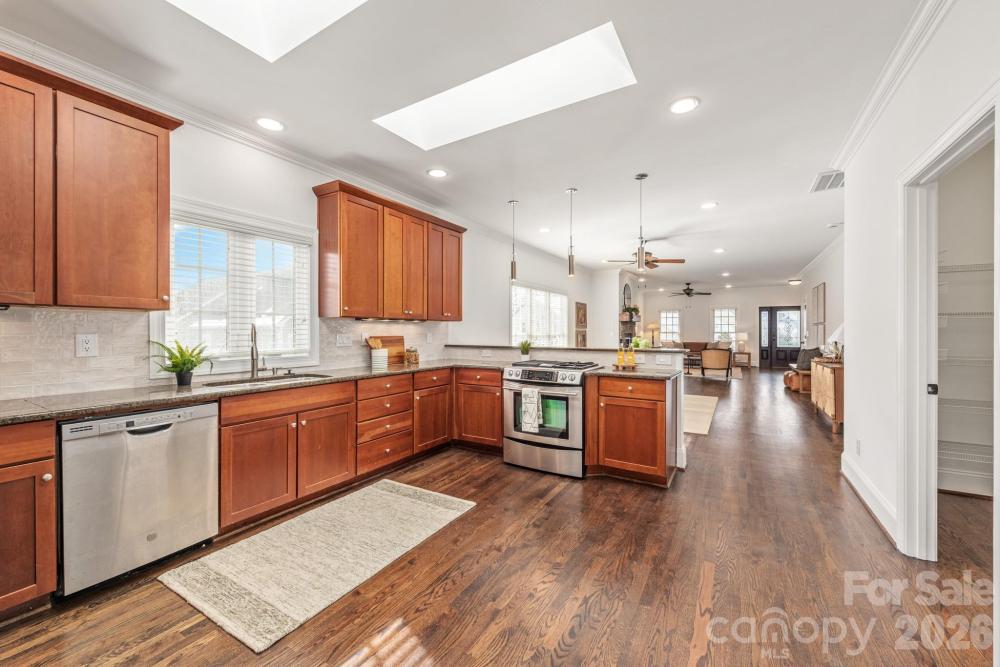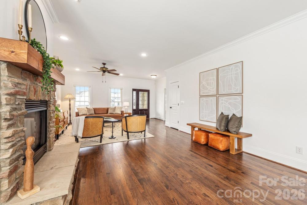 Welcome to 3542 Coleraine Avenue in the beautiful Kellswater Bridge Community. This corner-lot home is move-in ready and offers easy single-level living. Step inside to an open floor plan, tall ceilings and rays of natural light. Live large with spacious room sizes and multiple closets for all your storage needs. This home is elevated in style with newly refinished hardwood floors, heavy moldings and trim, shaker cabinets and a stacked-stone gas fireplace with warm wood mantle. Outside, enjoy the seasons of the Carolinas on the covered front porch or rear patio. This property is well manicured with mature landscaping and a lawn that has been taken care of. Rear-load 2-car garage and driveway. Kellswater Bridge offers excellent community amenities featuring a clubhouse, water-park style pool, sport courts, and playground. Be sure to schedule a tour today!