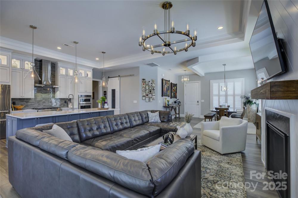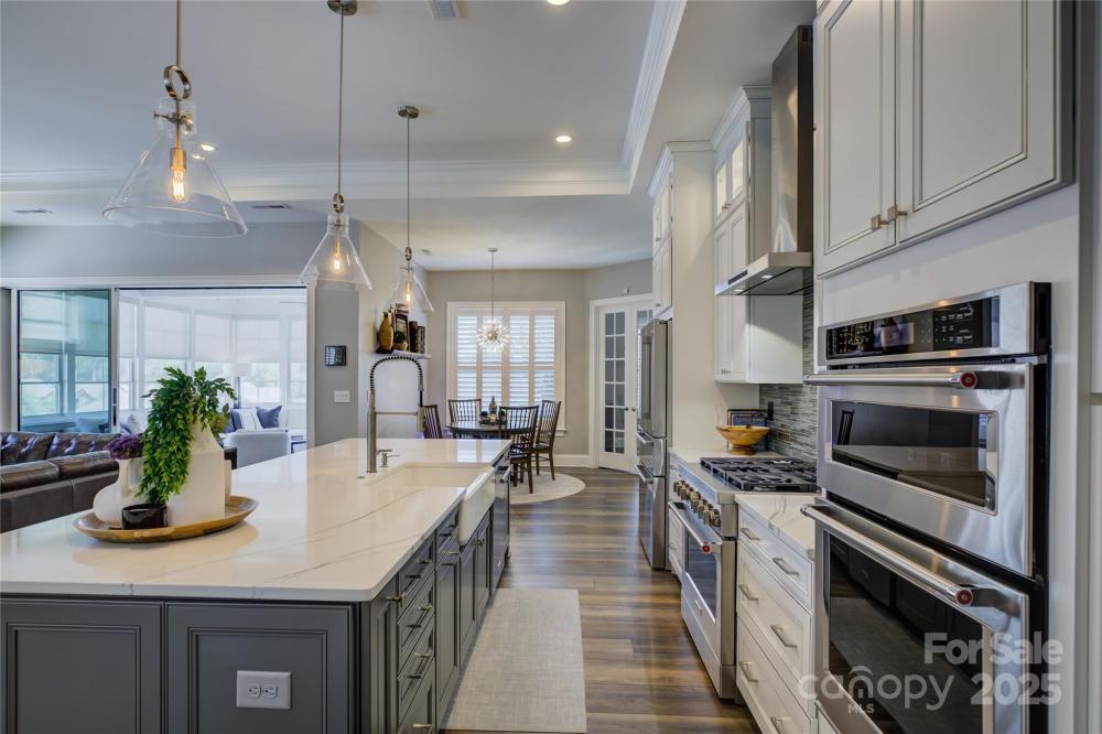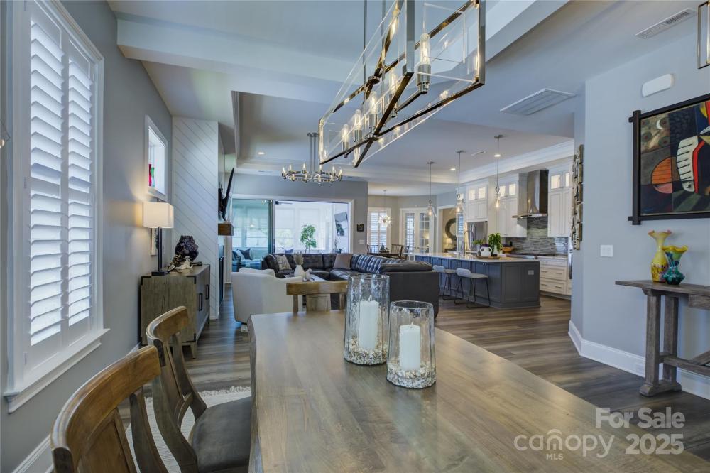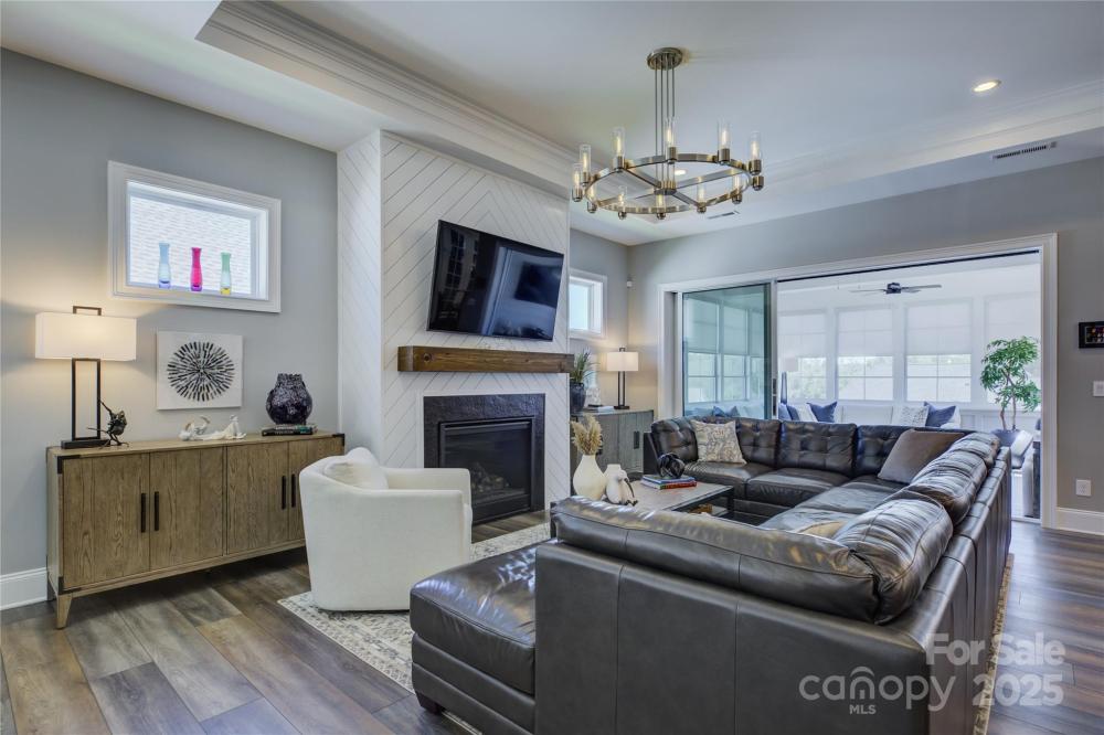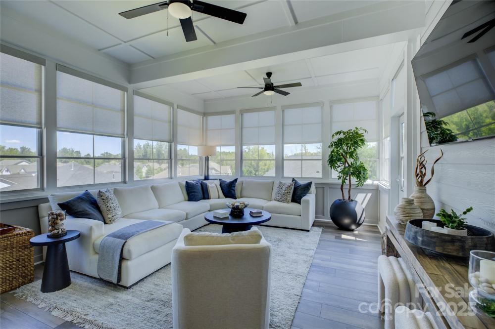 Exquisite home in the amenity-rich Regency at Palisades neighborhood. A rocking chair on the front porch offers a warm welcome to the home. The elegant dining room, situated just off the foyer, is ideal for both formal and casual entertaining. The shiplap-accented fireplace, with its rustic mantle, brings warmth to the great room. The gourmet kitchen is equipped with an oversized prep island that provides ample room for casual seating, a gas range/electric oven, and a stainless steel hood, extensive white cabinetry, and a truly impressive custom pantry. Just off the breakfast area is the private study, accessible through French doors. A fantastic all-season sunroom makes the most of the beautiful Carolina weather and opens onto a deck perfect for grilling out.. The spacious primary suite has a tray ceiling and an elegant chandelier. The spa-like bath has a marble walk-in shower, dual vanities, and custom cabinetry and shelving. An efficient laundry room, complete with a built-in folding shelf, cabinetry, and a drop zone, helps keep the home running smoothly. Spacious bedrooms 2 & 3 share a hall bath. Above the garage is a fabulous, insulated, and drywalled walk-up storage space that everyone needs. Regency HOA includes lawn maintenance, a 20,000 sq. ft clubhouse with an on-site concierge service, indoor & outdoor pools, tennis & pickleball courts.
